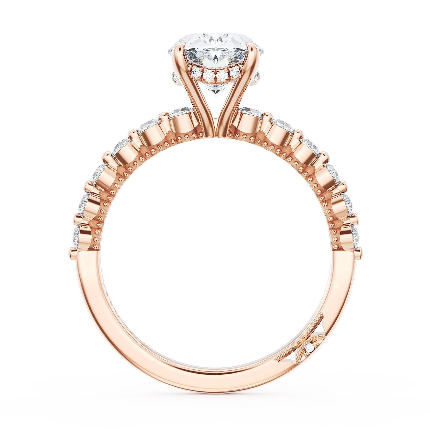An Oval Solitaire is set into an 18kt Rose Gold foundation. Masterfully set round brilliant diamonds trace up the ceiling and hand-hewn beading adds texture to the silhouette.