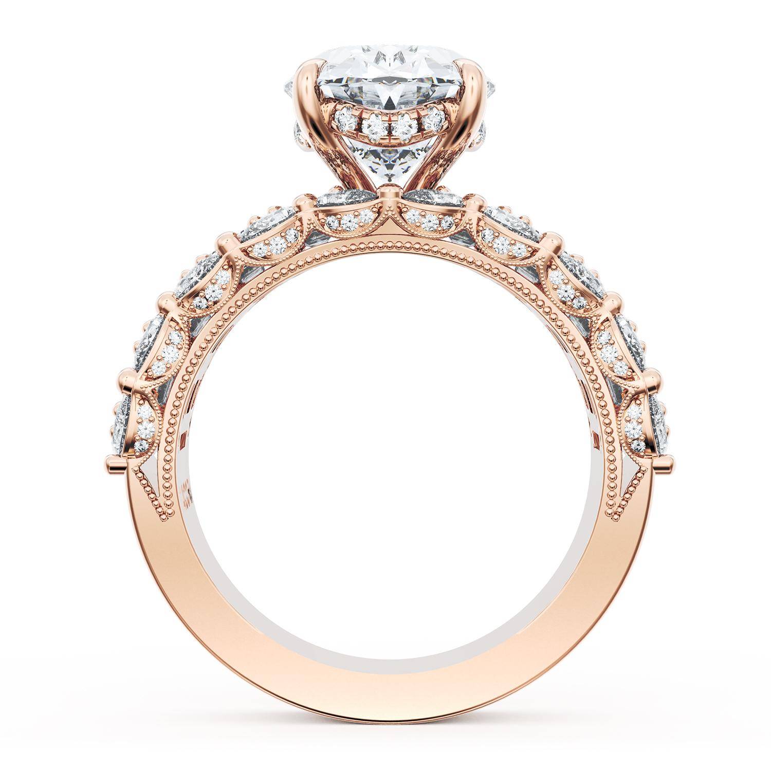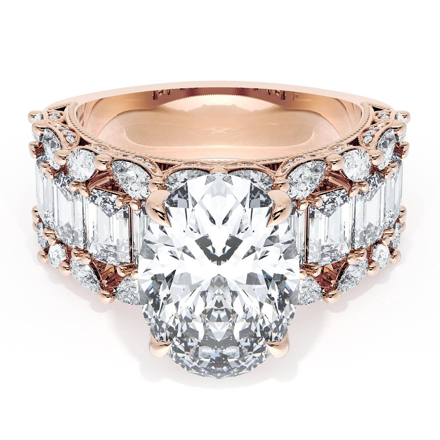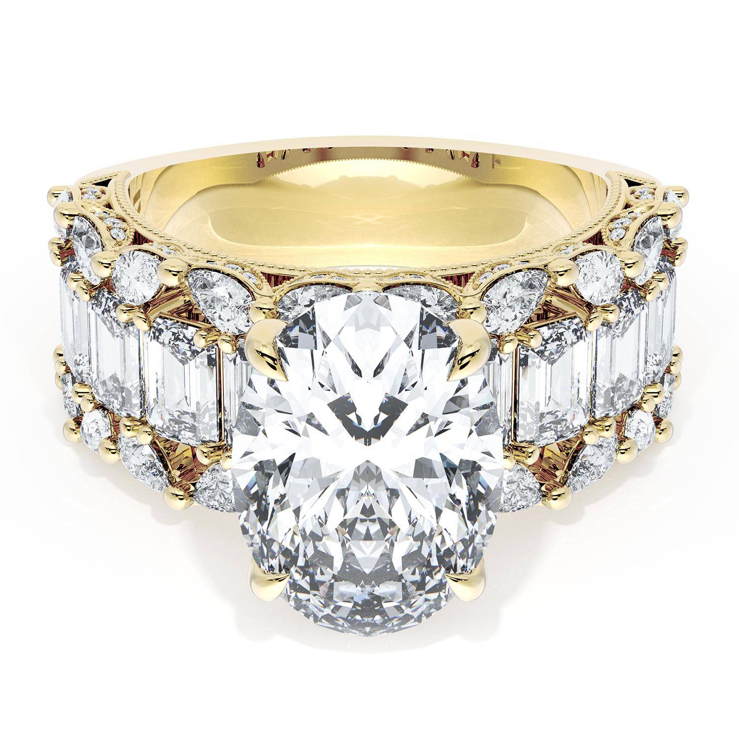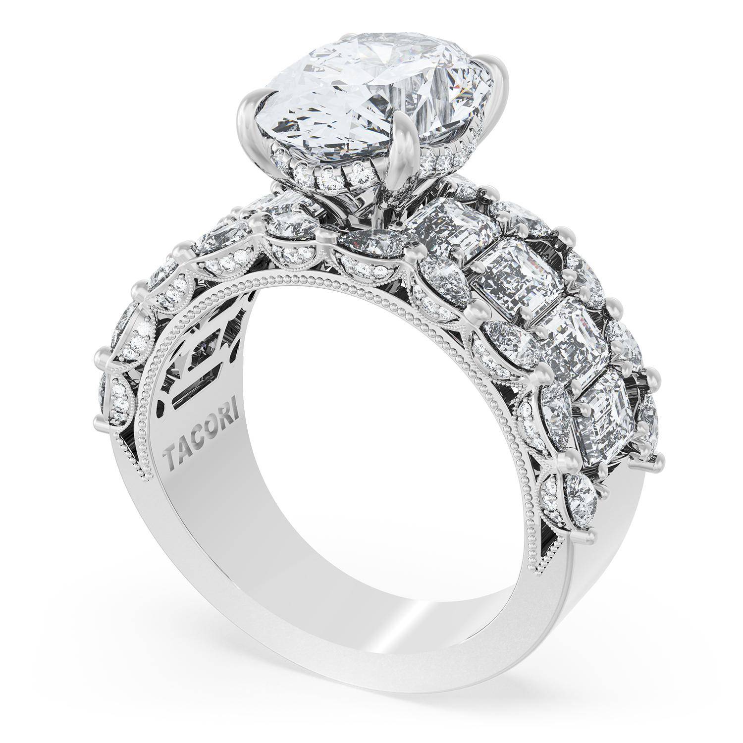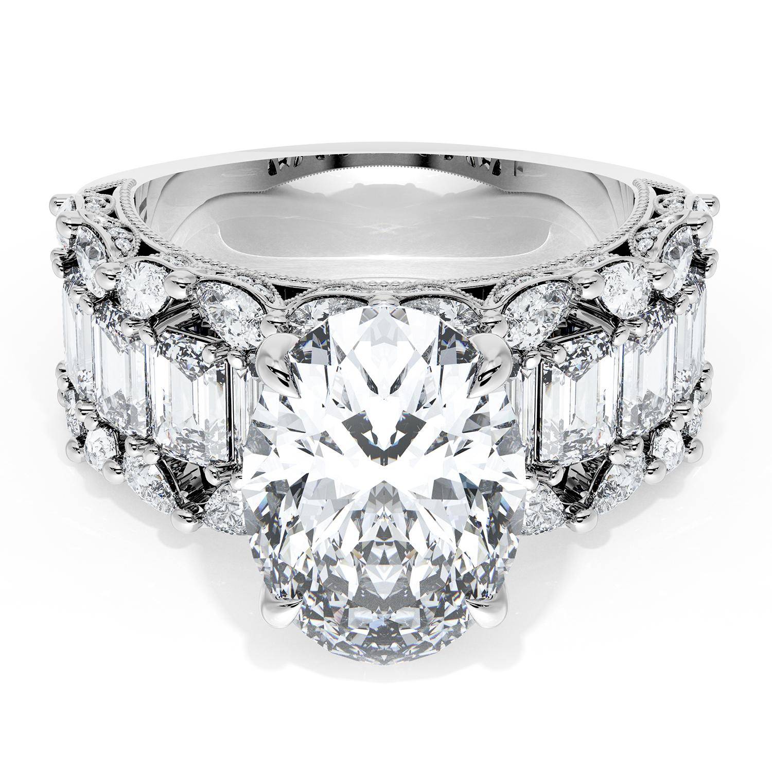 | Additional Description | An Oval cut center stone is set into a brilliant and mosaic-like ceiling of emerald and pear cut diamonds. Classic Crescent detailing decorates the inner face silhouette of the band. |