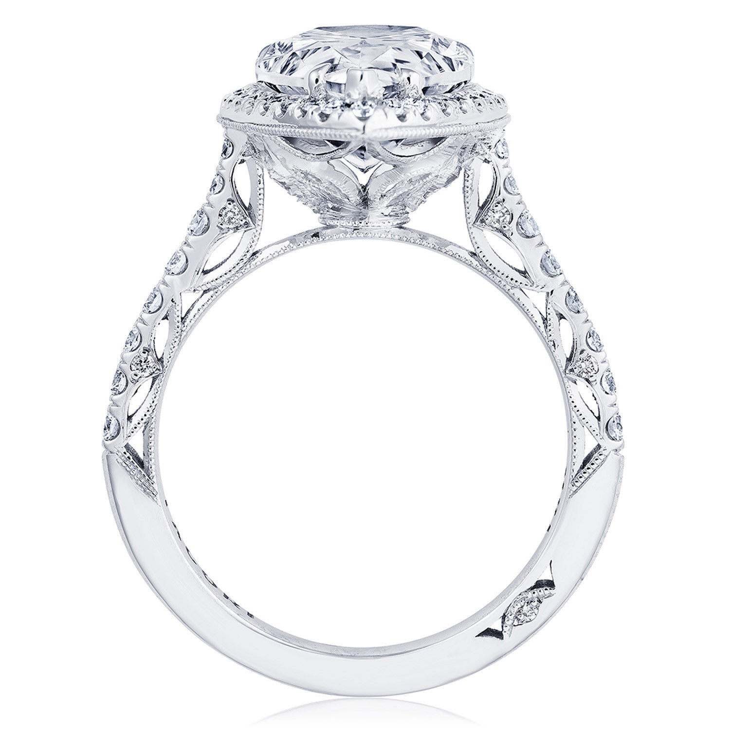 | Additional Description | A subtle Spotlight Bloom encircles the center stone, and more brilliance is added by the meticulous French pavé that leads up the ceiling. A lace-like Crescent Fabric, edged with milgrain, gives stunning texture to the inner face profile. |