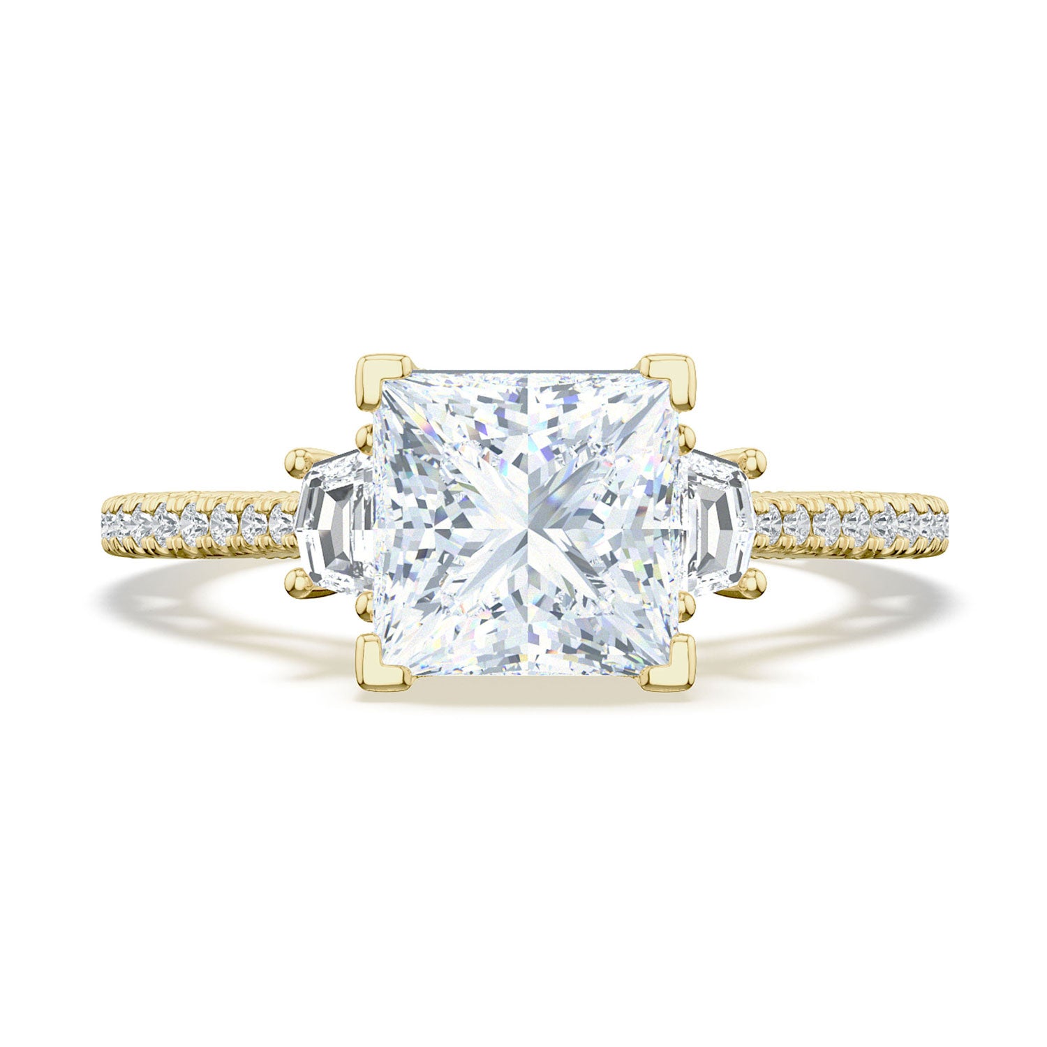 Milgrain-edged Crescents create radiant windows of light, while round-brilliant diamonds at each Crescent junction are hand-set with triple beading. A pave ceiling leads towards the three-stone crown with a hidden bloom.
