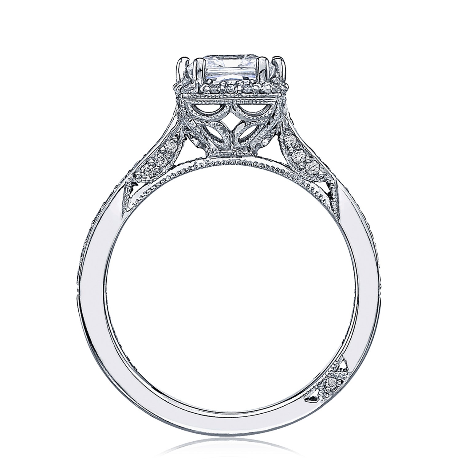 | Additional Description | Spotlight diamonds give depth and dimension to a princess cut diamond with diamonds adorning the lower level of the crown, hand set in pavé along the ceiling, and glittering in Tacori crescent details along the sides of a high polished band. |
