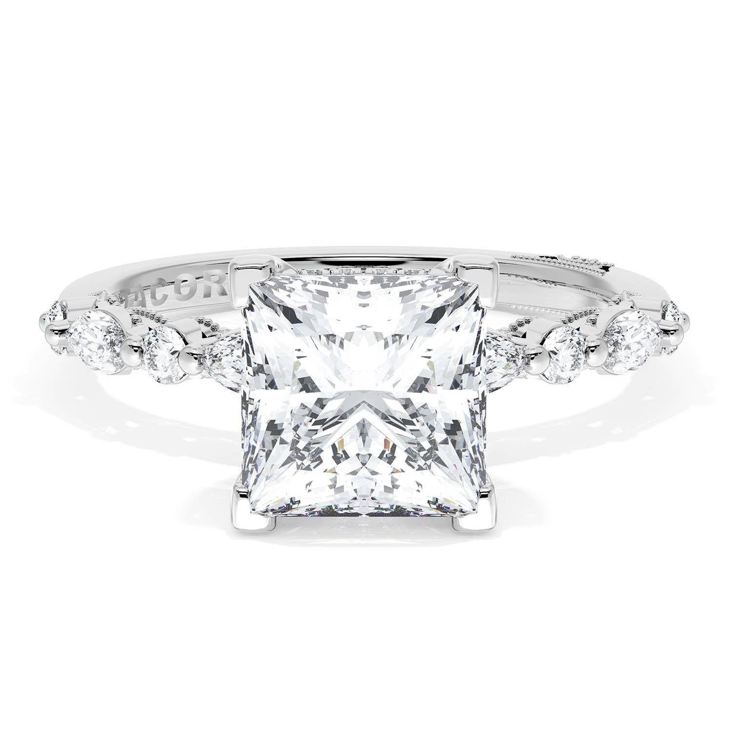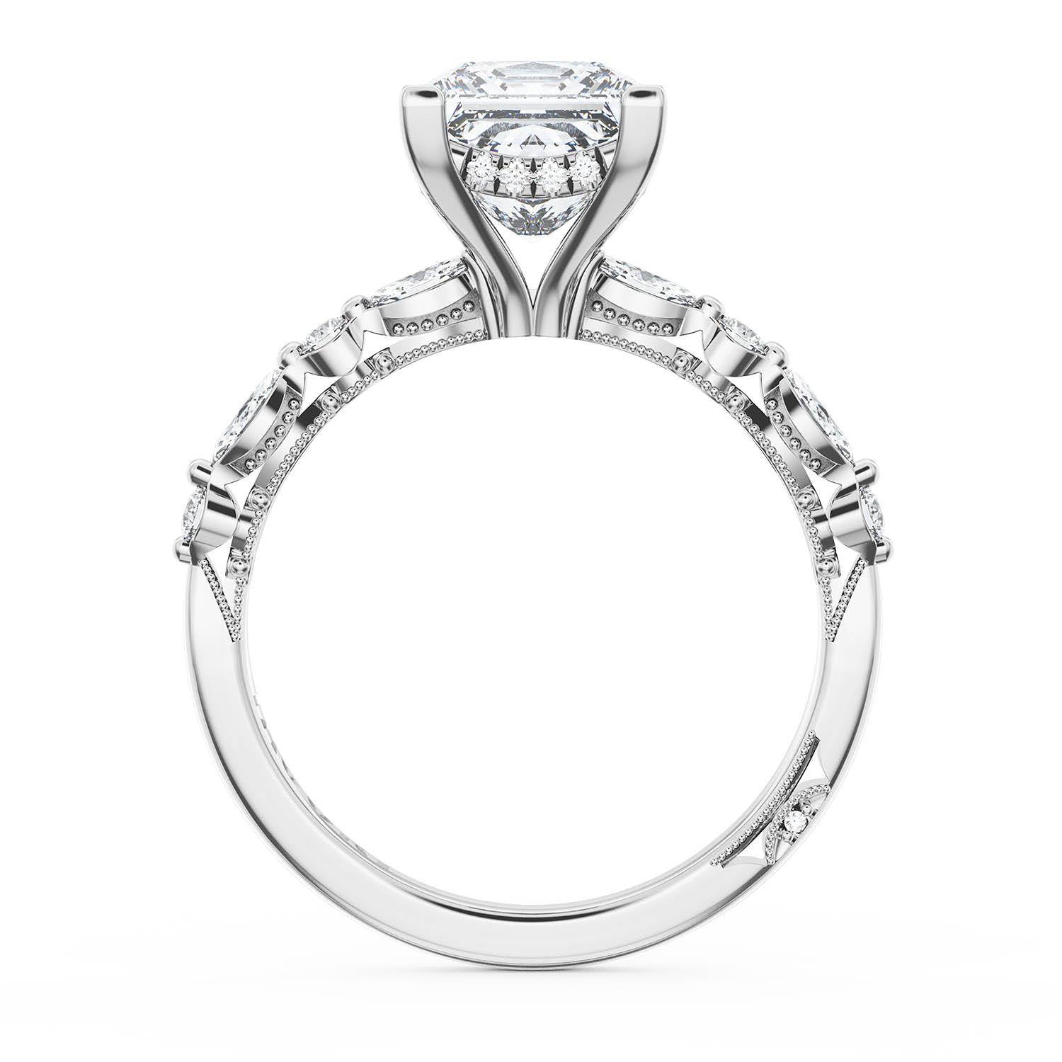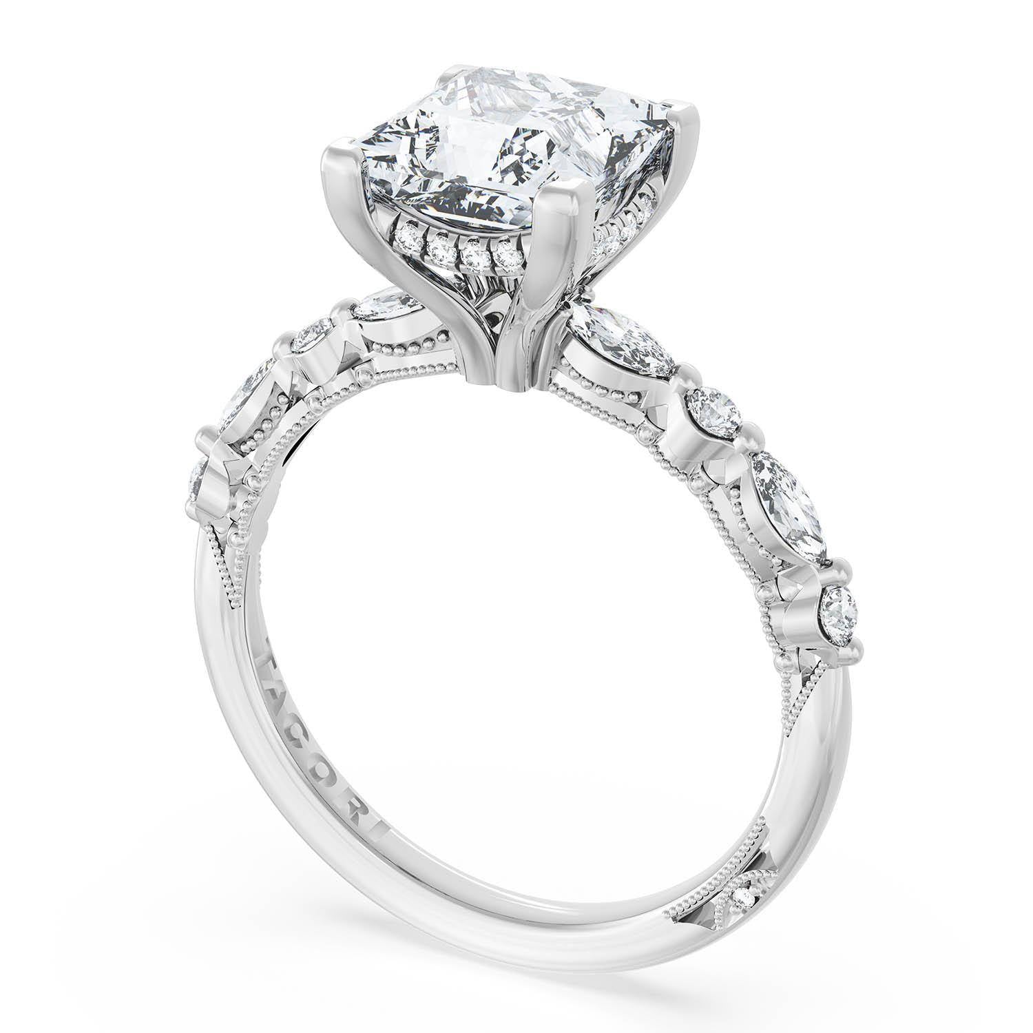A Princess Solitaire is set into a Platinum foundation. Alternating marquise and round brilliant diamonds trace up the ceiling and hand-hewn beading adds texture to the silhouette.