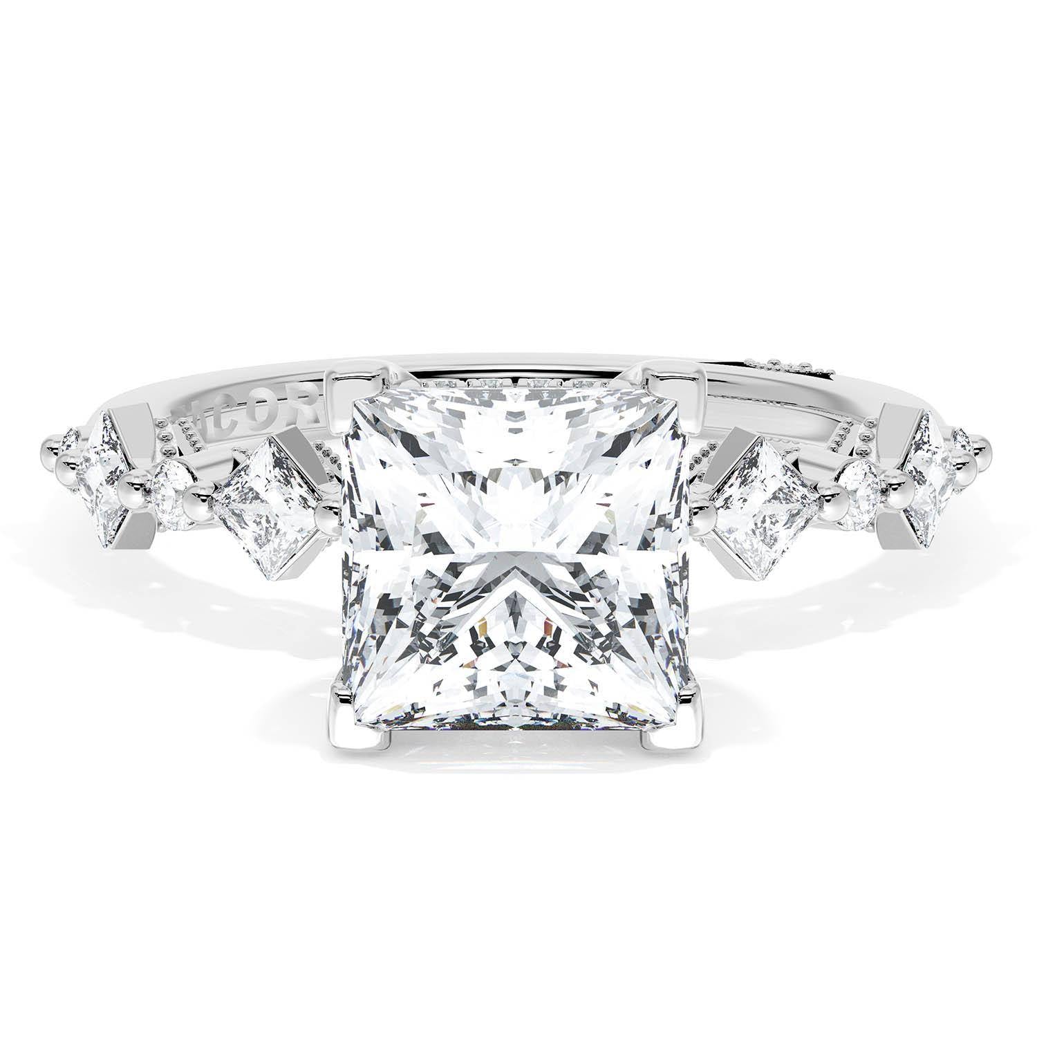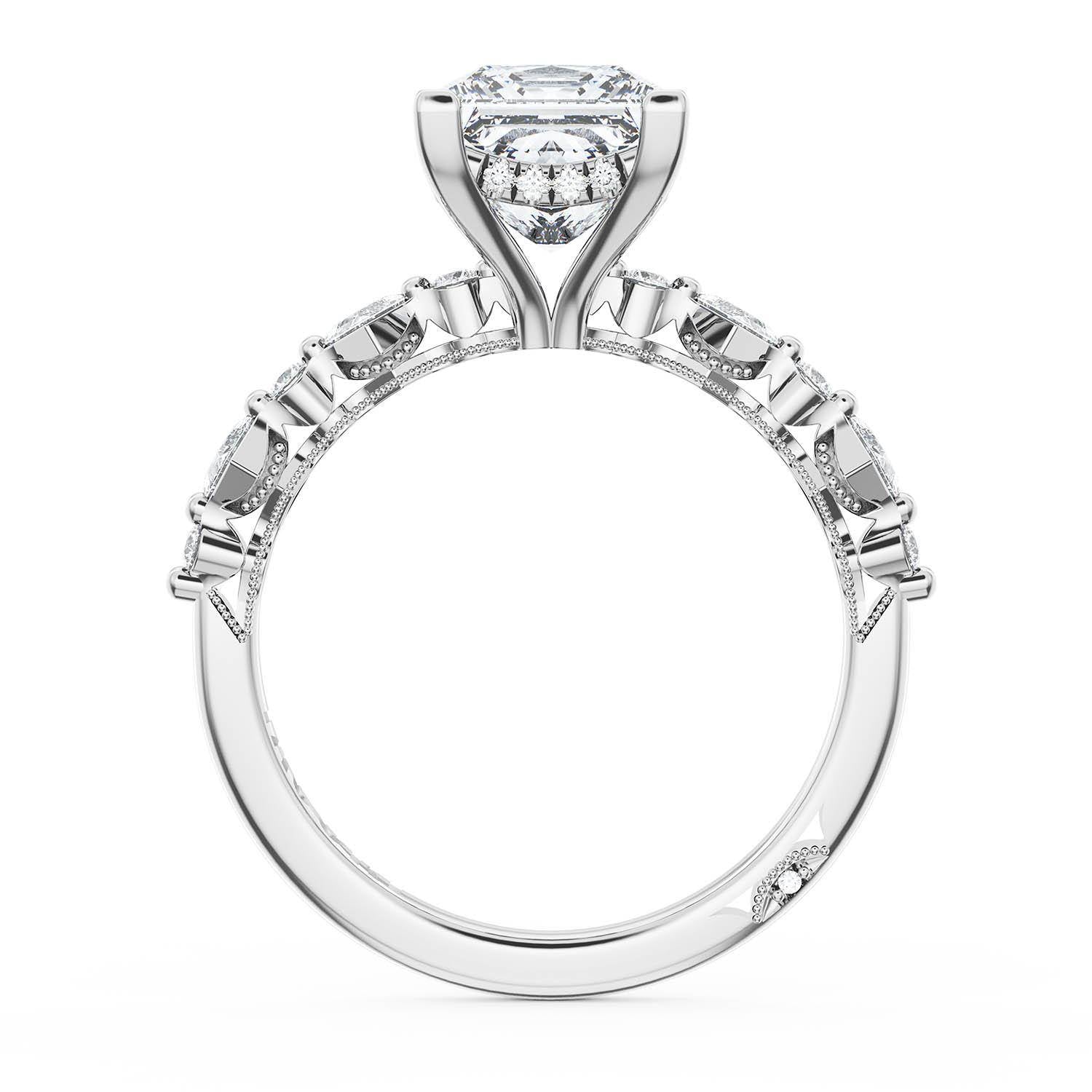 A Princess Solitaire is set into an 18kt White Gold foundation. Alternating carré and round brilliant diamonds trace up the ceiling and hand-hewn beading adds texture to the silhouette.