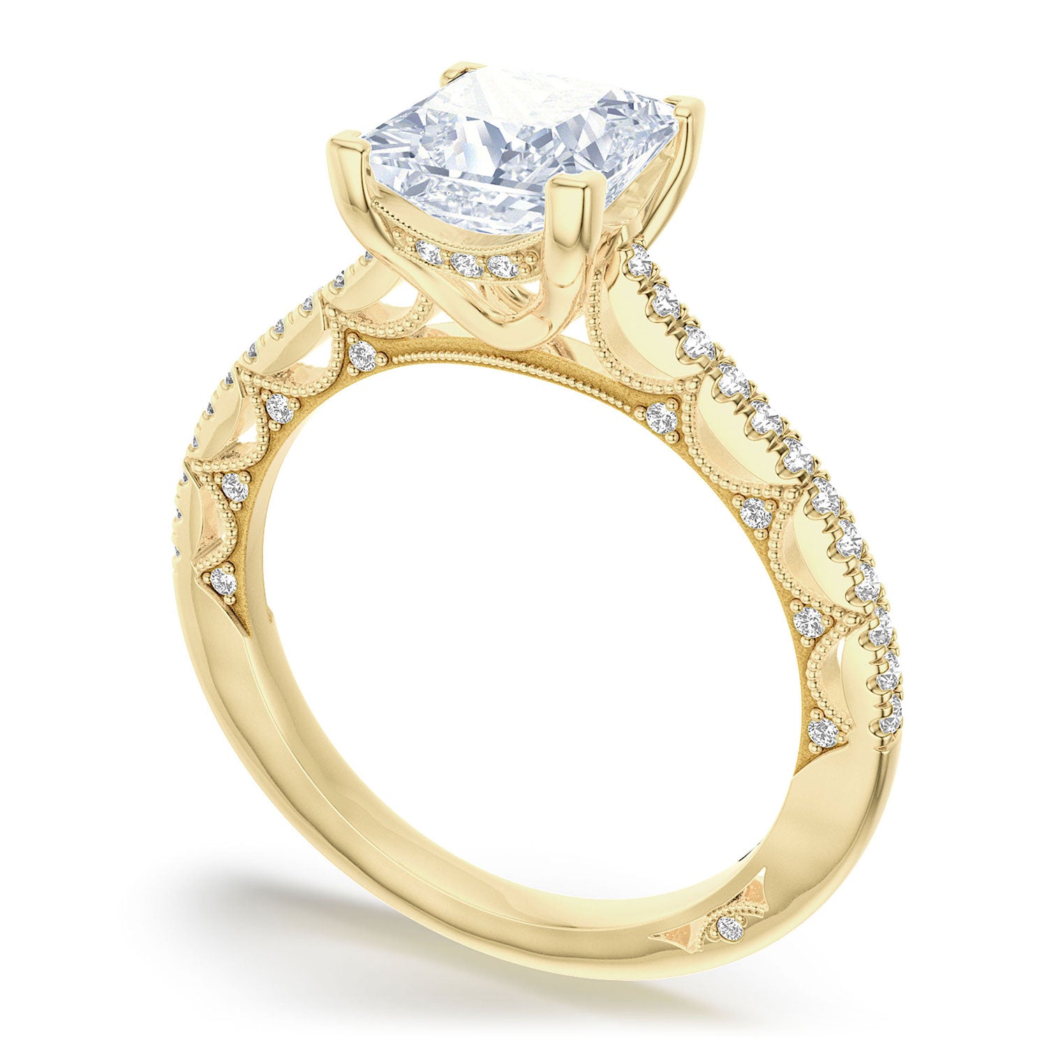 | Additional Description | Milgrain-edged Crescents glow across the inner face, while round-brilliant diamonds, hand-set with triple beading, add radiance. A pave ceiling traces towards the center stone, which sits above a hidden bloom on a Cathedral foundation. |