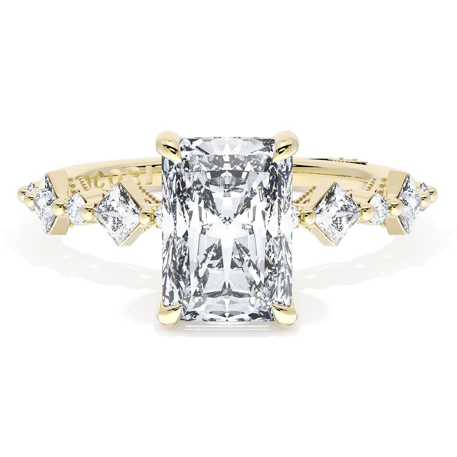 A Radiant Solitaire is set into an 18kt Yellow Gold foundation. Alternating carré and round brilliant diamonds trace up the ceiling and hand-hewn beading adds texture to the silhouette.
