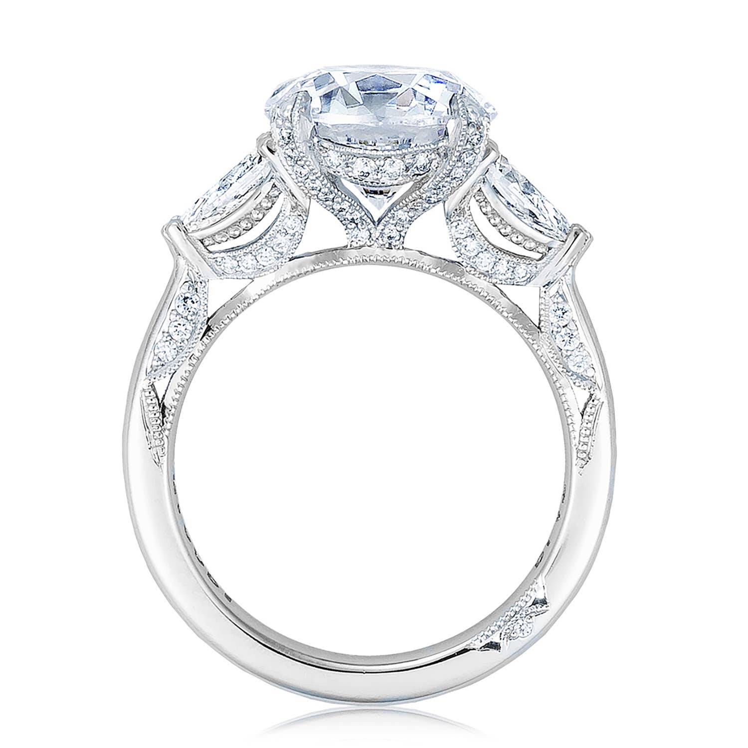 | Additional Description | Two pear side stones frame the center stone, all of which are set into the diamond-studded prongs of a Cathedral foundation. Intricate milgrian and diamond Simply Tacori crescent fabric decorates the innerface of the band. |