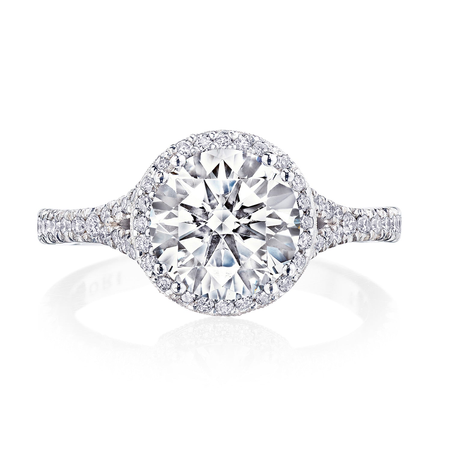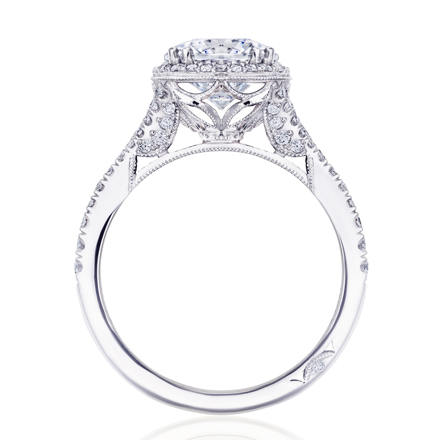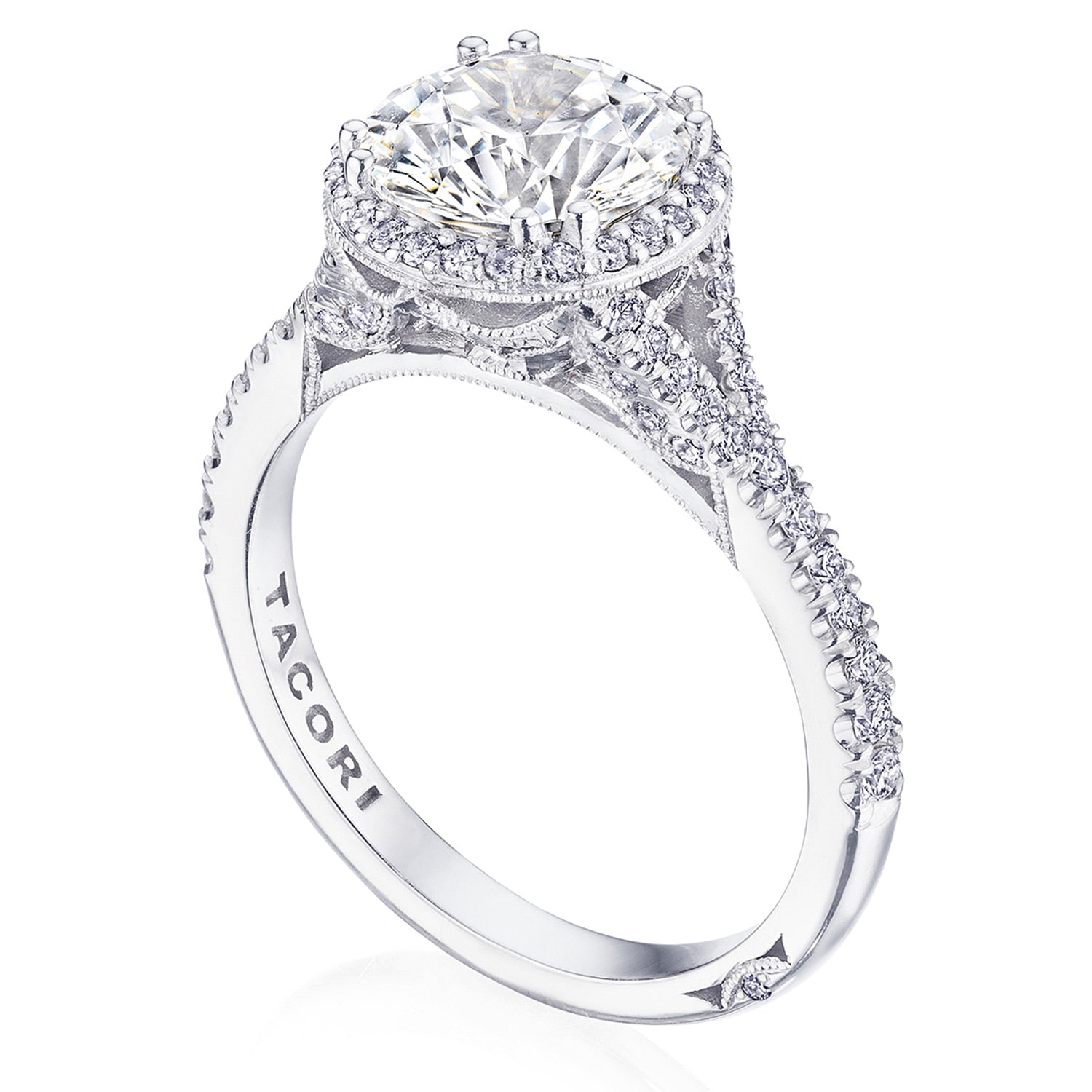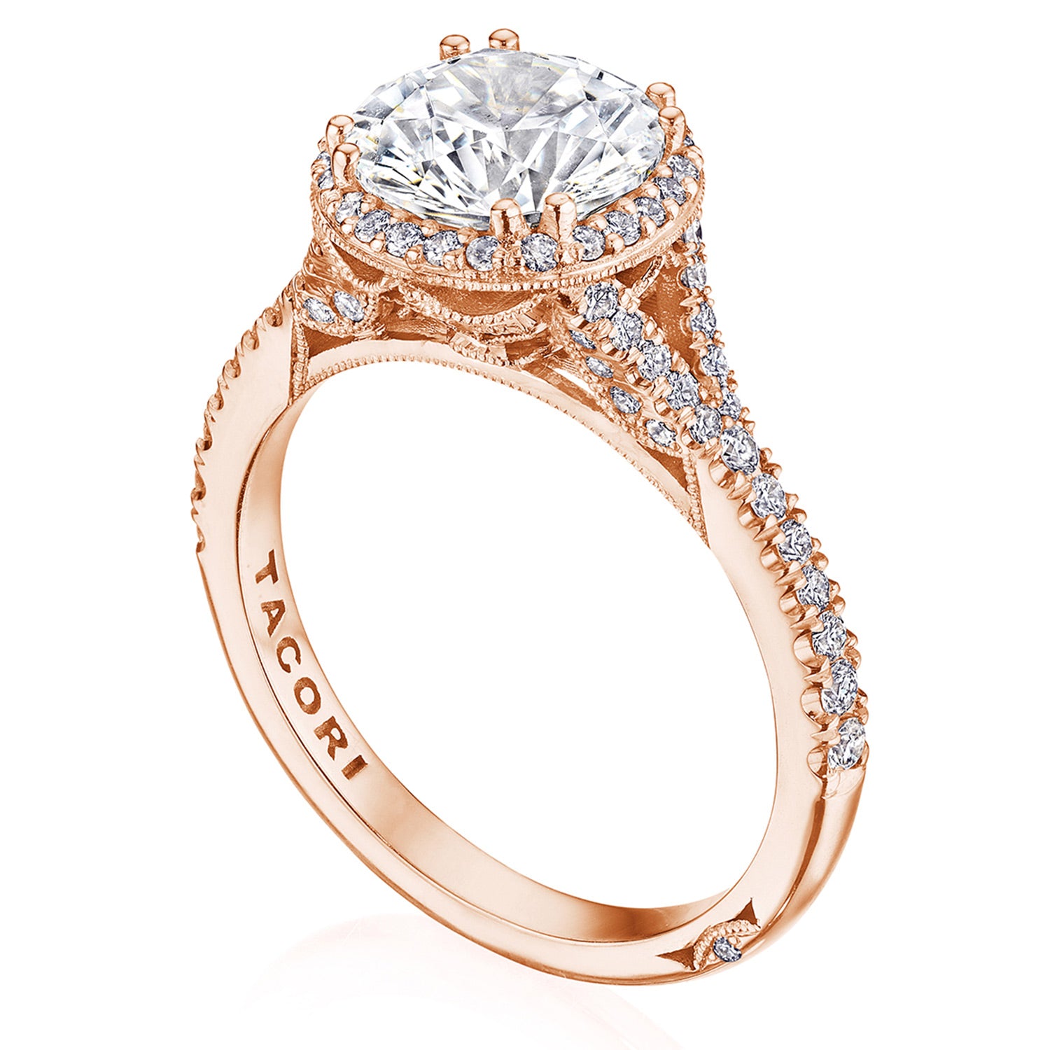 | Additional Description | A TACORI bloom elevates the center stone, which rests on a lace-like, milgrian-studded Cathedral foundation. A pavé ceiling branches and embraces the solitaire, while a signature crescent marks the resting point of the ring. |