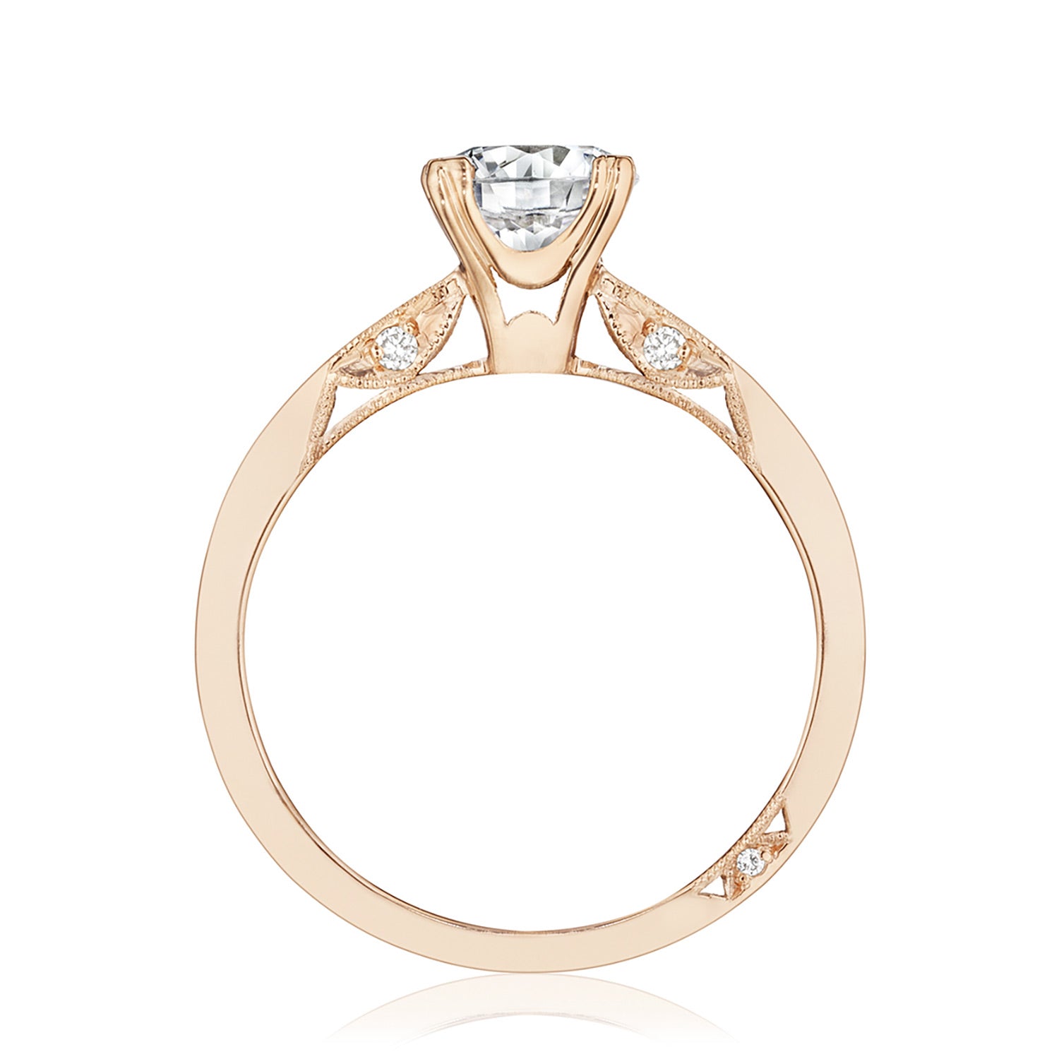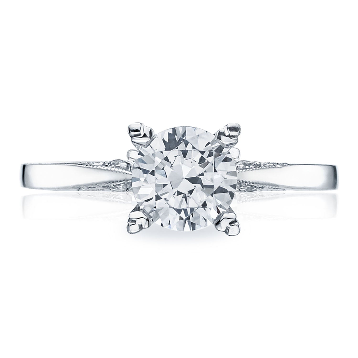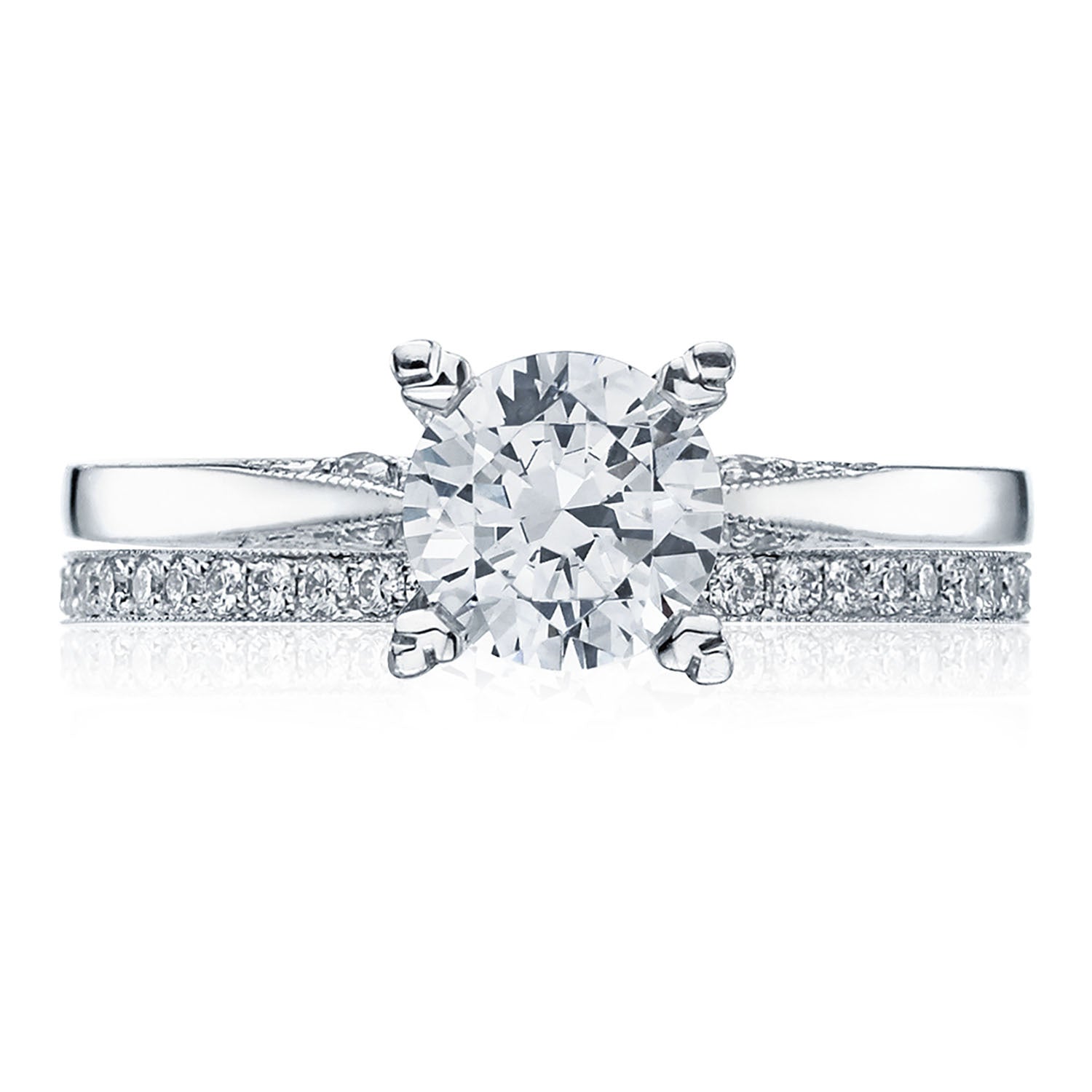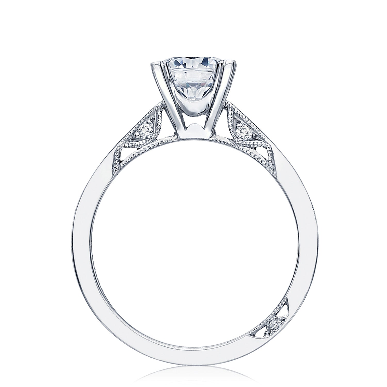 | Additional Description | A tapered, high-polish band of Simply TACORI crescent fabric is decorated with hand-engraved milgrain and studs of round-brilliant diamonds. A metal-intense Cathedral foundation embraces the solitaire. |