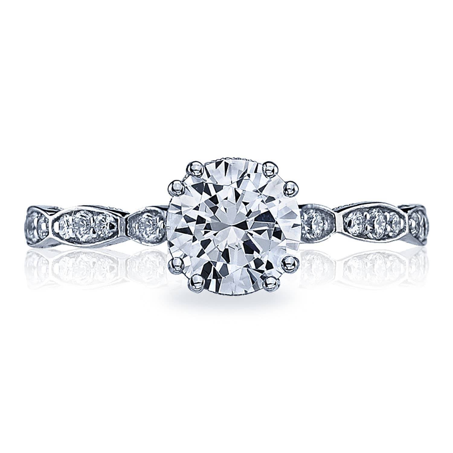 | Additional Description | Round-brilliant diamonds form marquise shapes along the ceiling of the ring, while the innerface is decorated with Sculpted Crescent fabric. The solitaire sits atop an intricate, milgrain-studded Cathedral foundation. |
