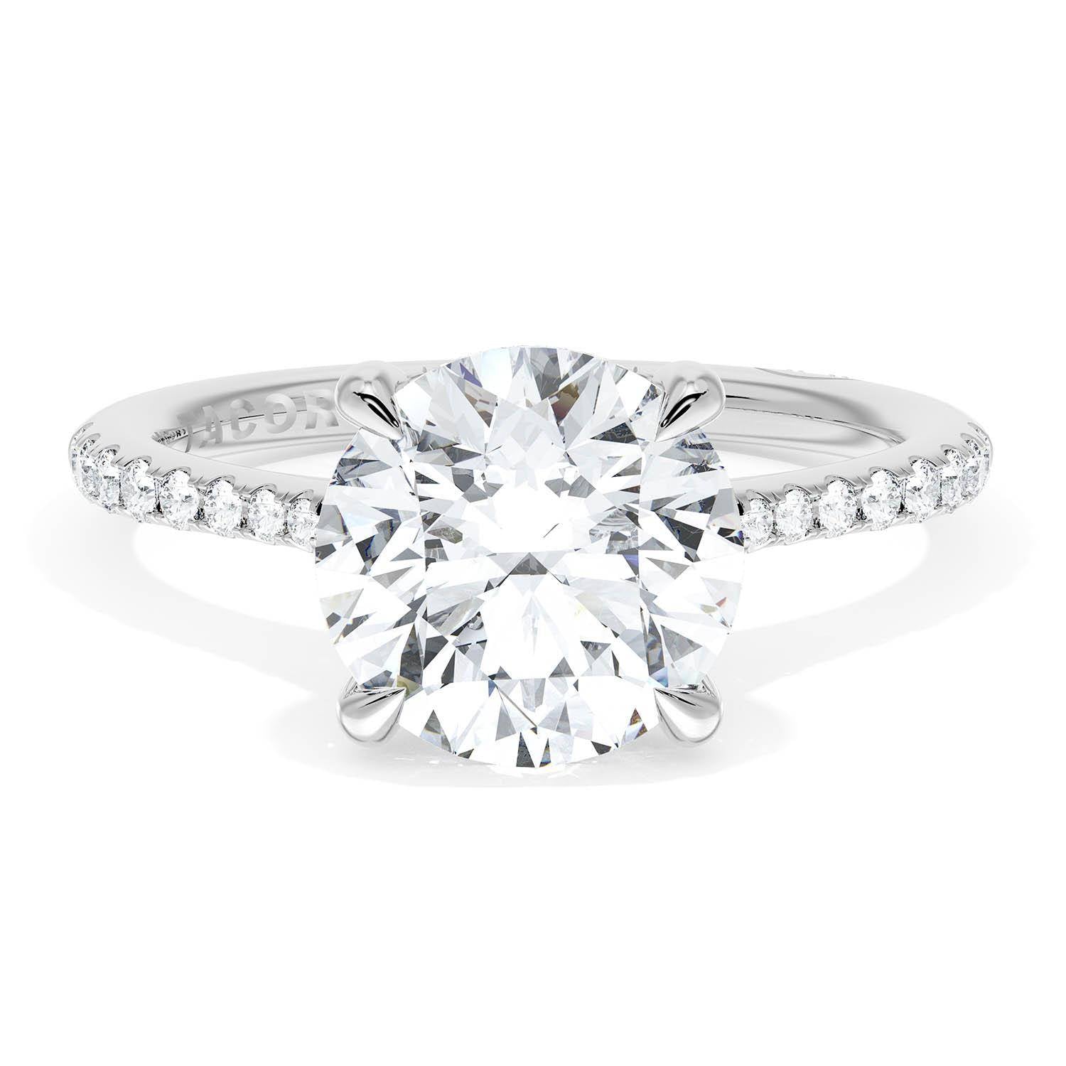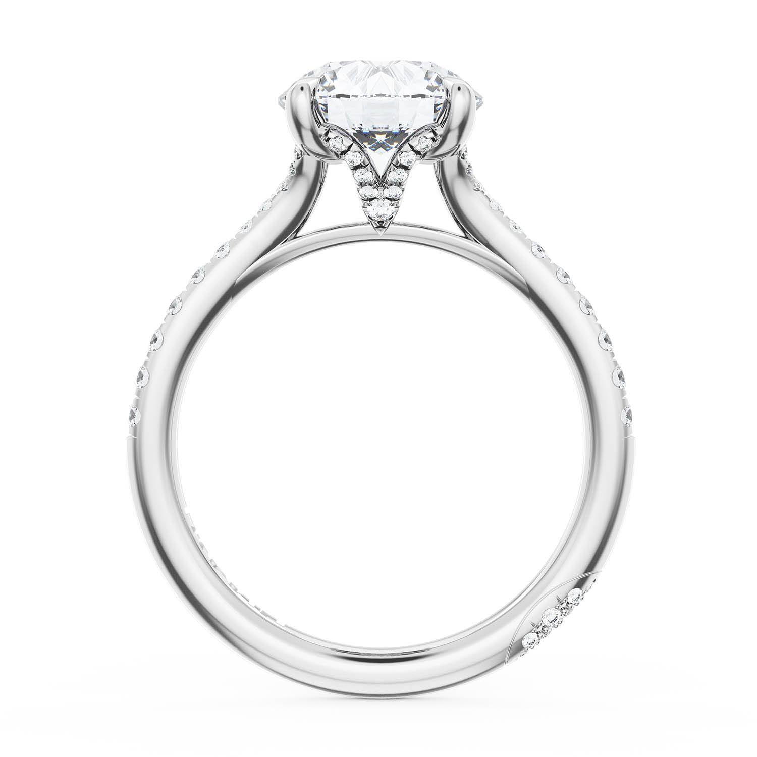 A Round Solitaire is set into a unique corset-inspired crown on a Platinum foundation. Pavé-set diamonds decorate the ceiling and a diamond-studded Founder's Crescent marks the resting point.