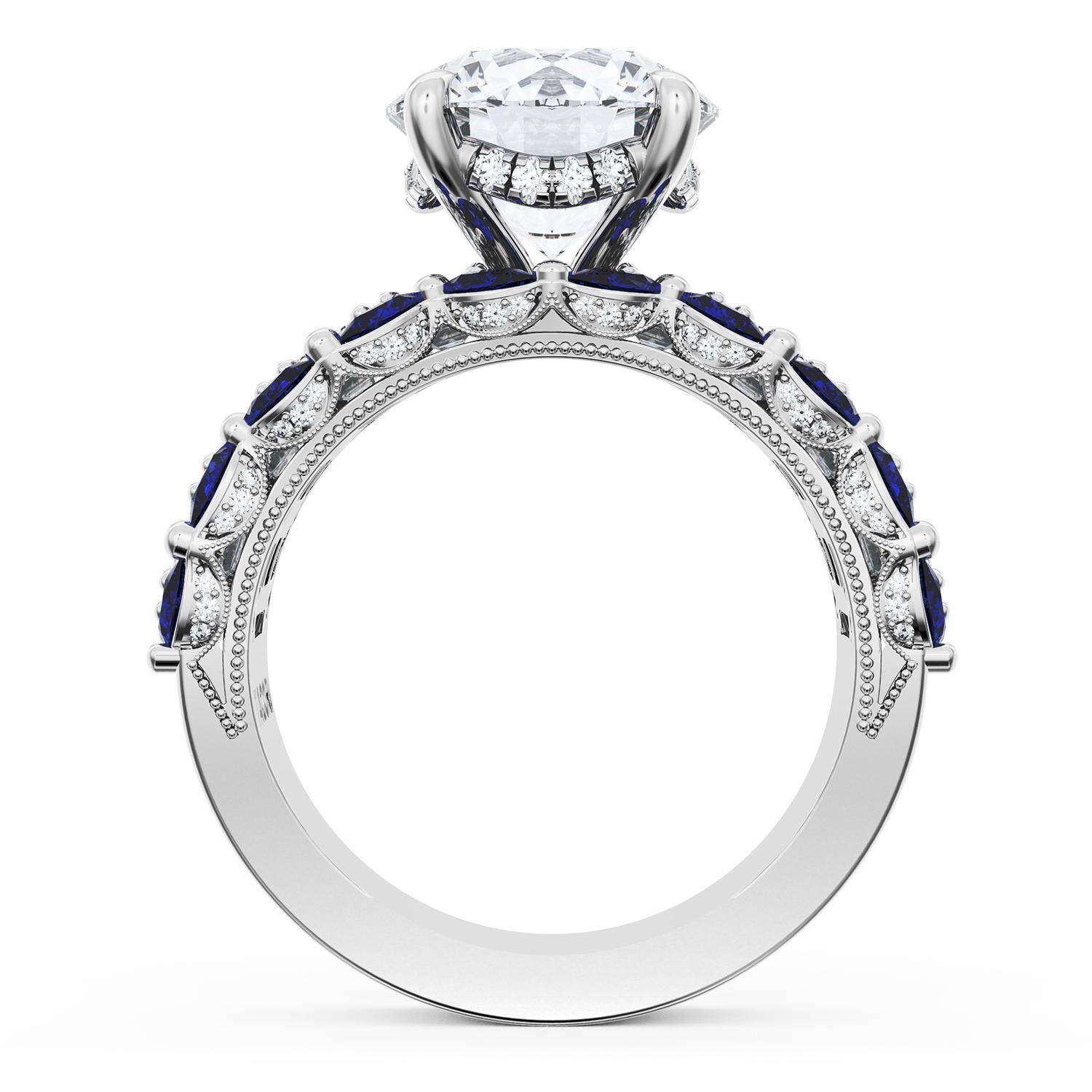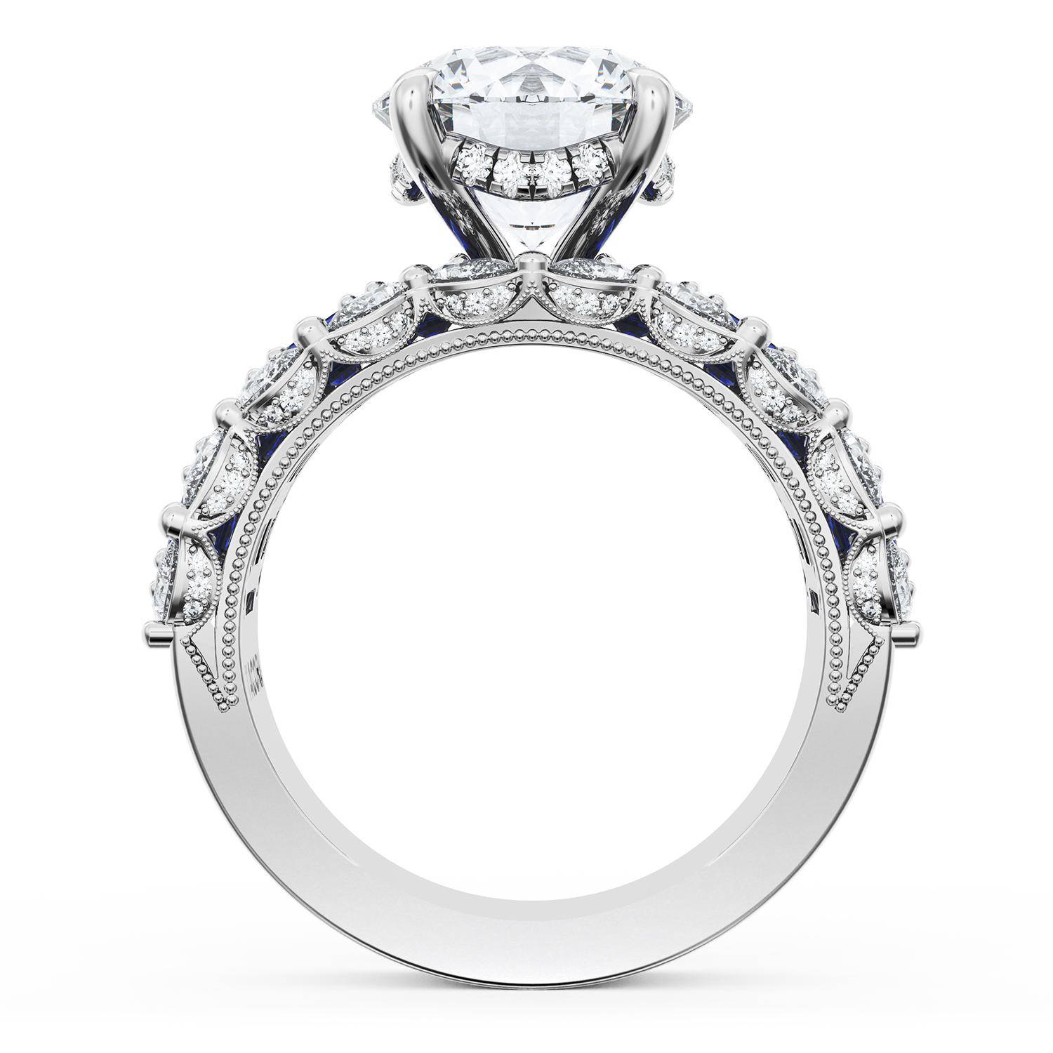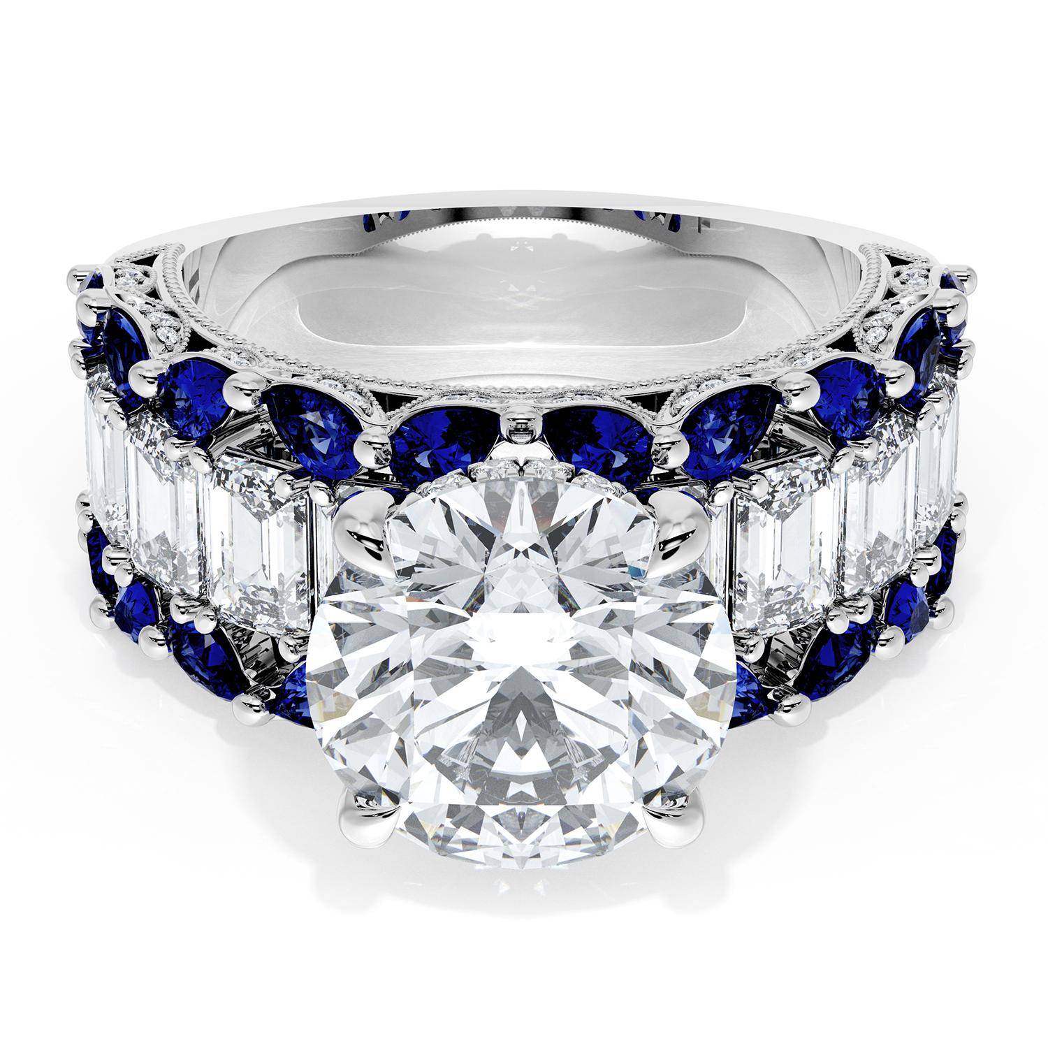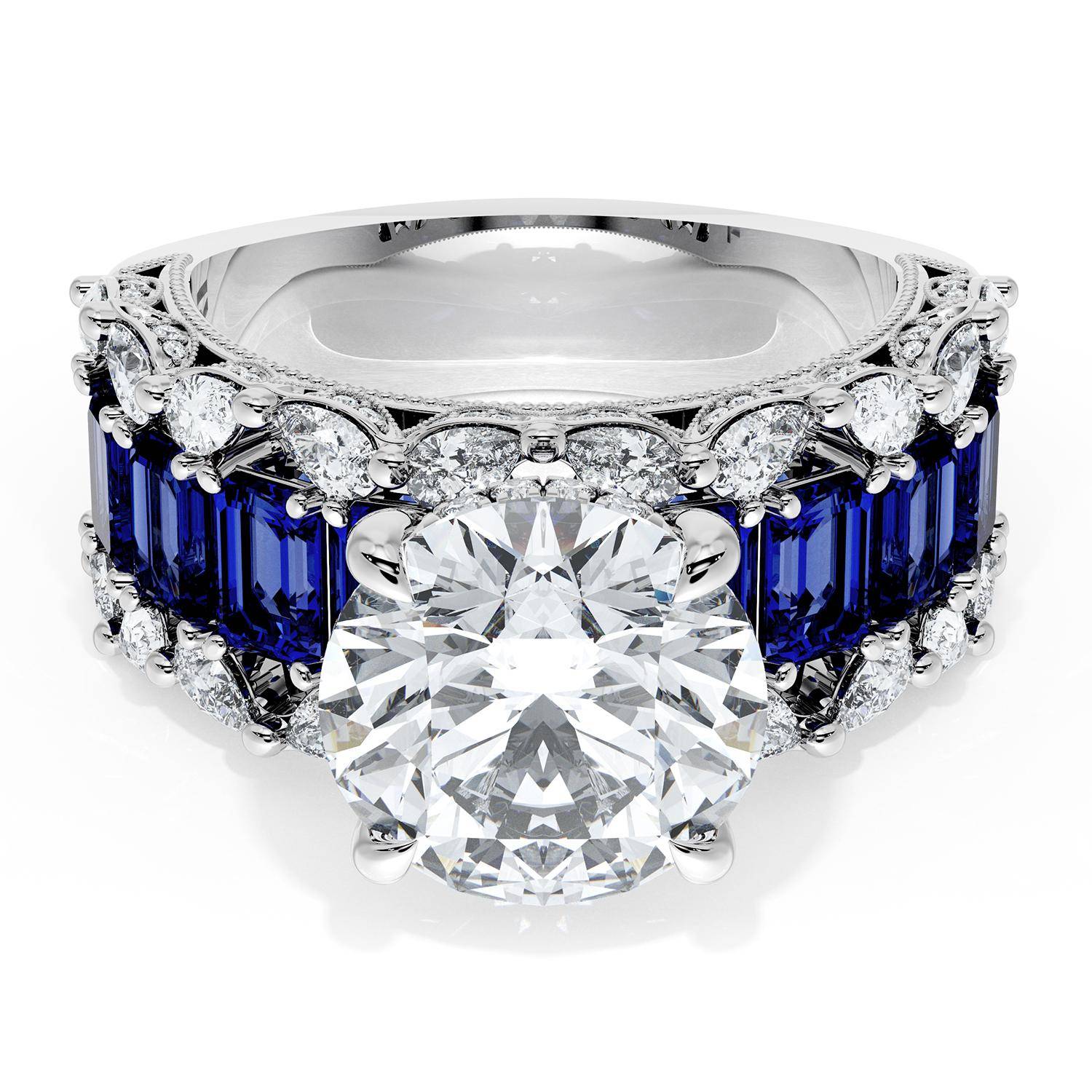 | Additional Description | A Round brilliant cut center stone is set into a brilliant and mosaic-like ceiling of emerald and pear cut gemstones. Classic Crescent detailing decorates the inner face silhouette of the band. |