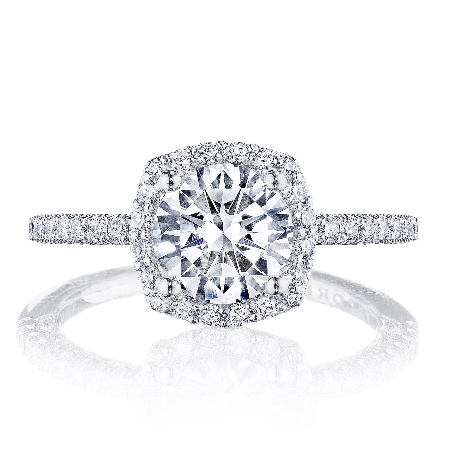 | Additional Description | Pave-set diamonds decorate the ceiling, while a cushion bloom adds dimension to the center stone. The crown floats on a Classic 360 foundation above a band of Petite Crescent with more diamond detailing. A Signature Crescent marks the resting point. |