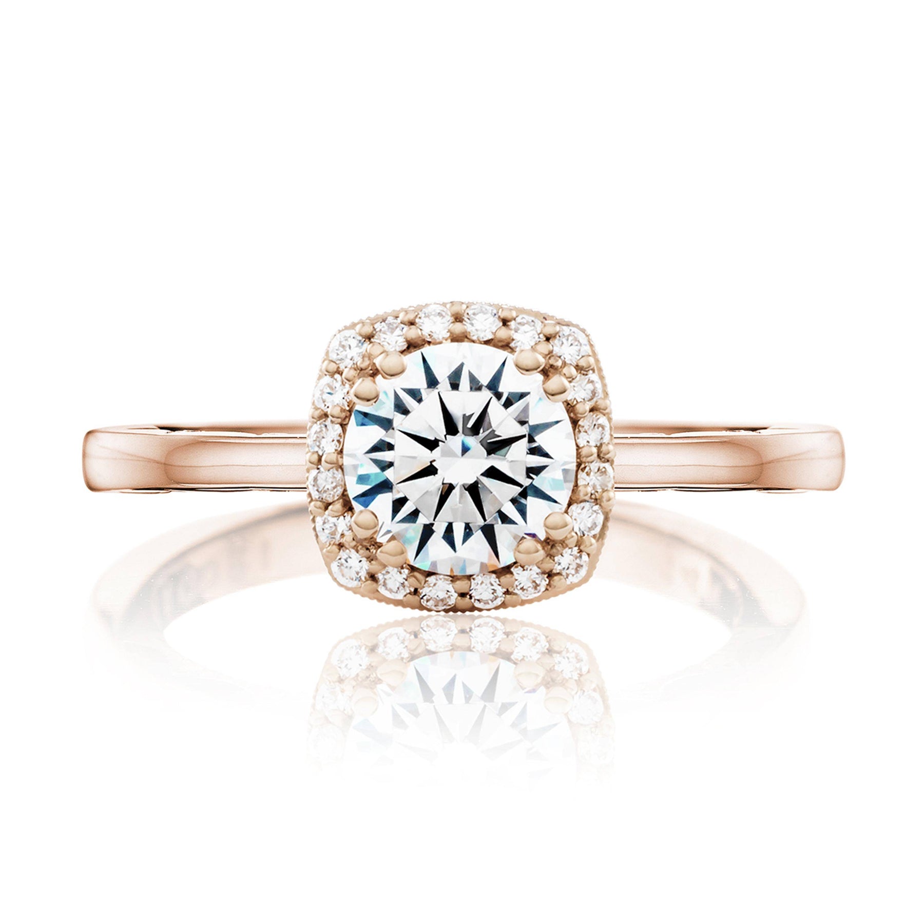 Love in bloom. The beauty in the simplicity of this round brilliant cut diamond engagement ring with a cushion bloom is amplified by the Coastal Crescent inner face, with a diamond-cuddled detailing underneath the crescent.