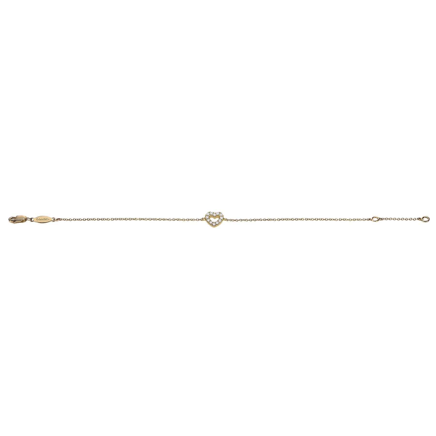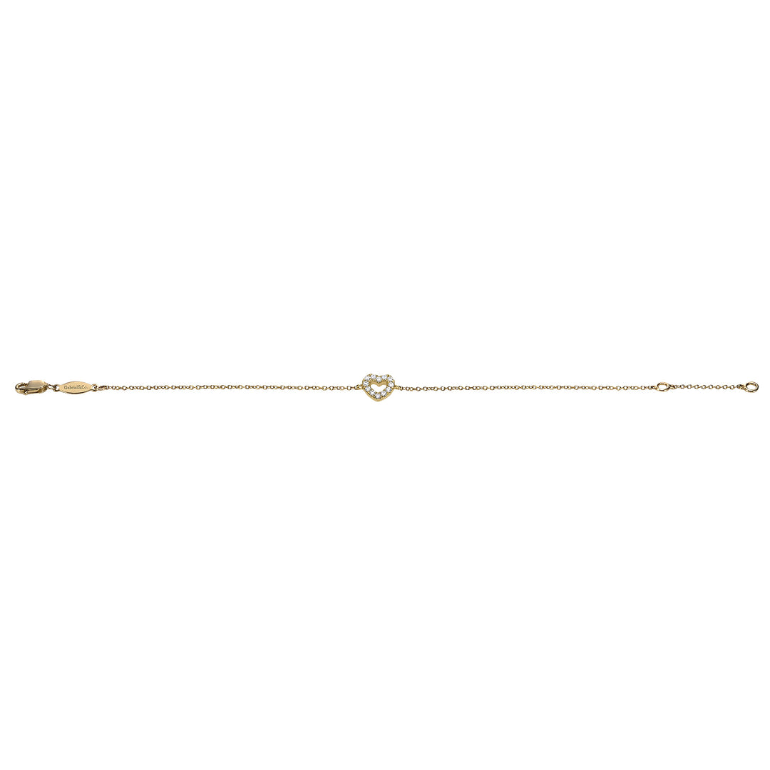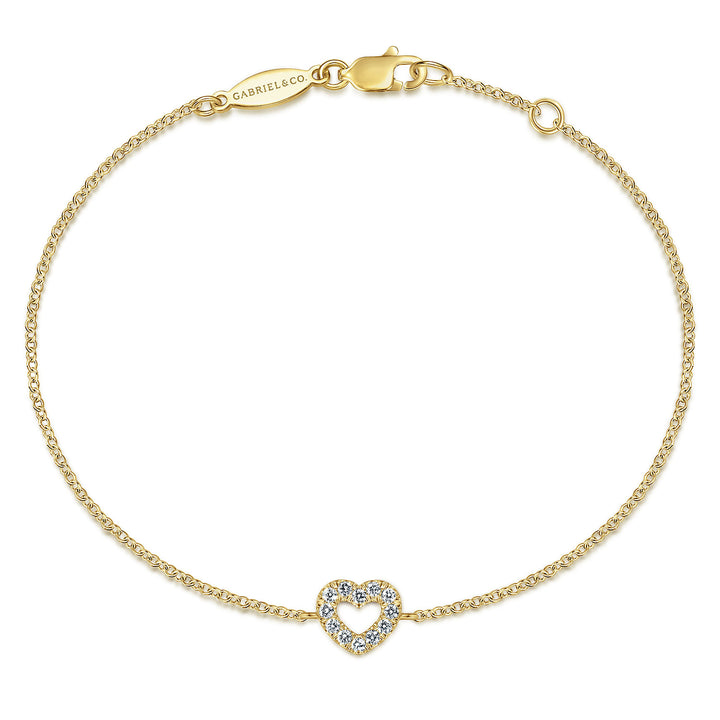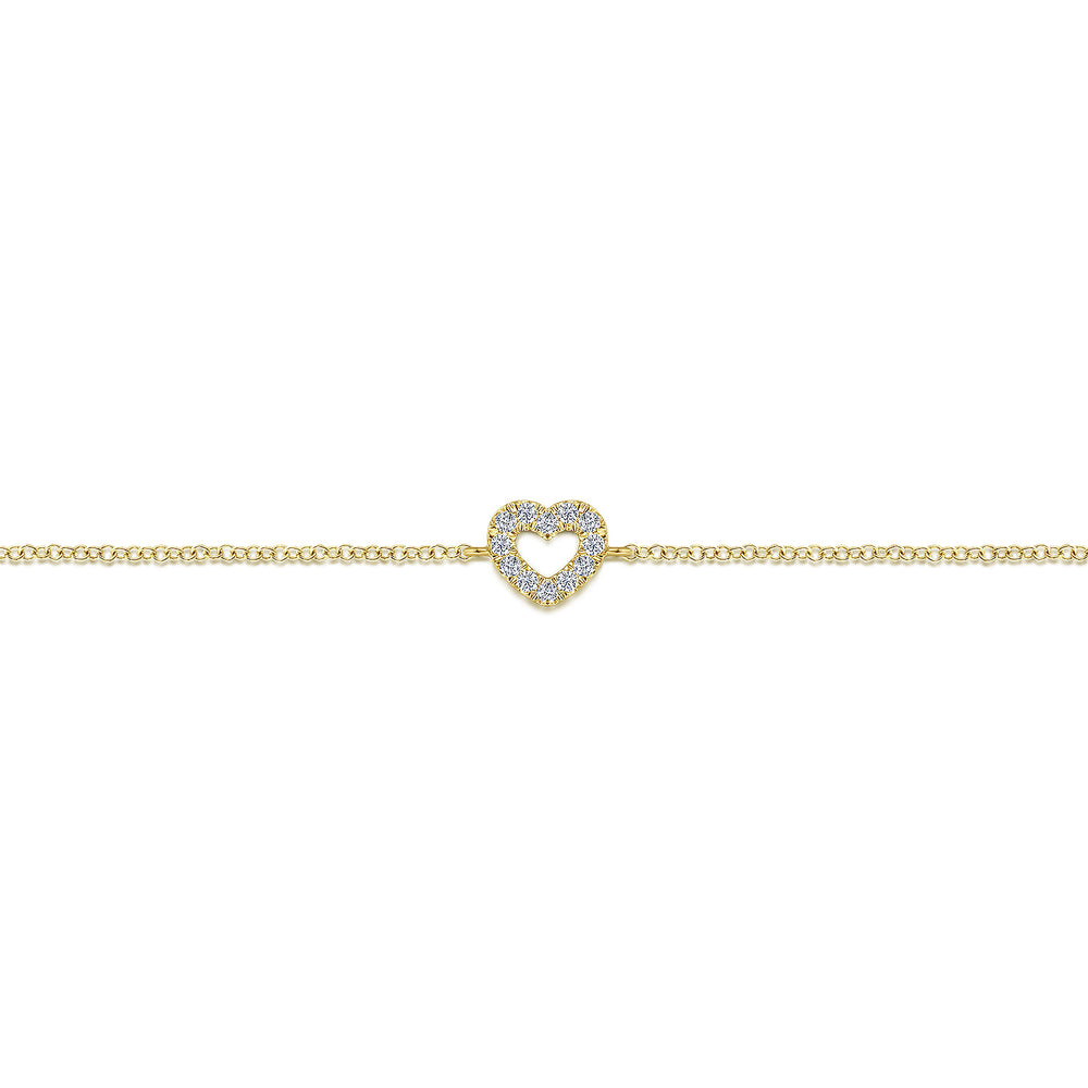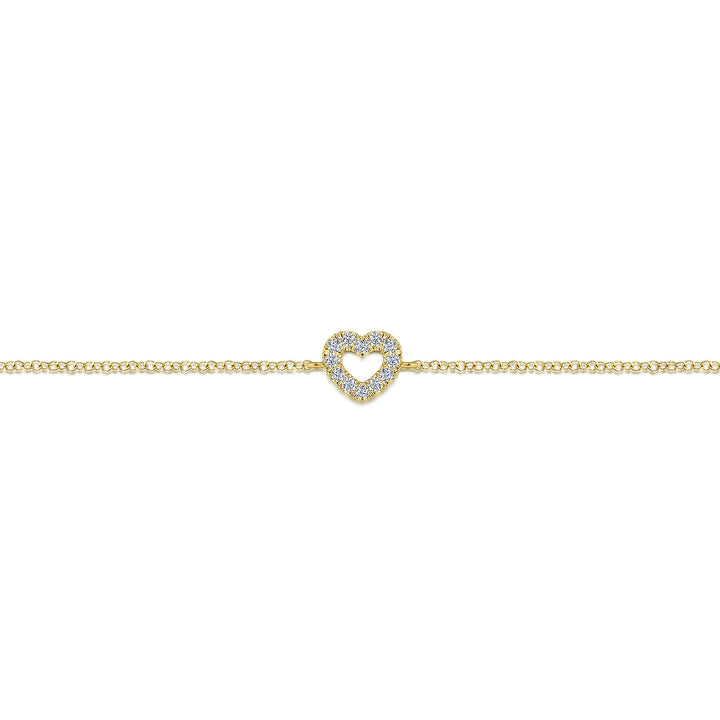 A romantic pave diamond heart silhouette is integrated into this adjustable yellow gold bracelet