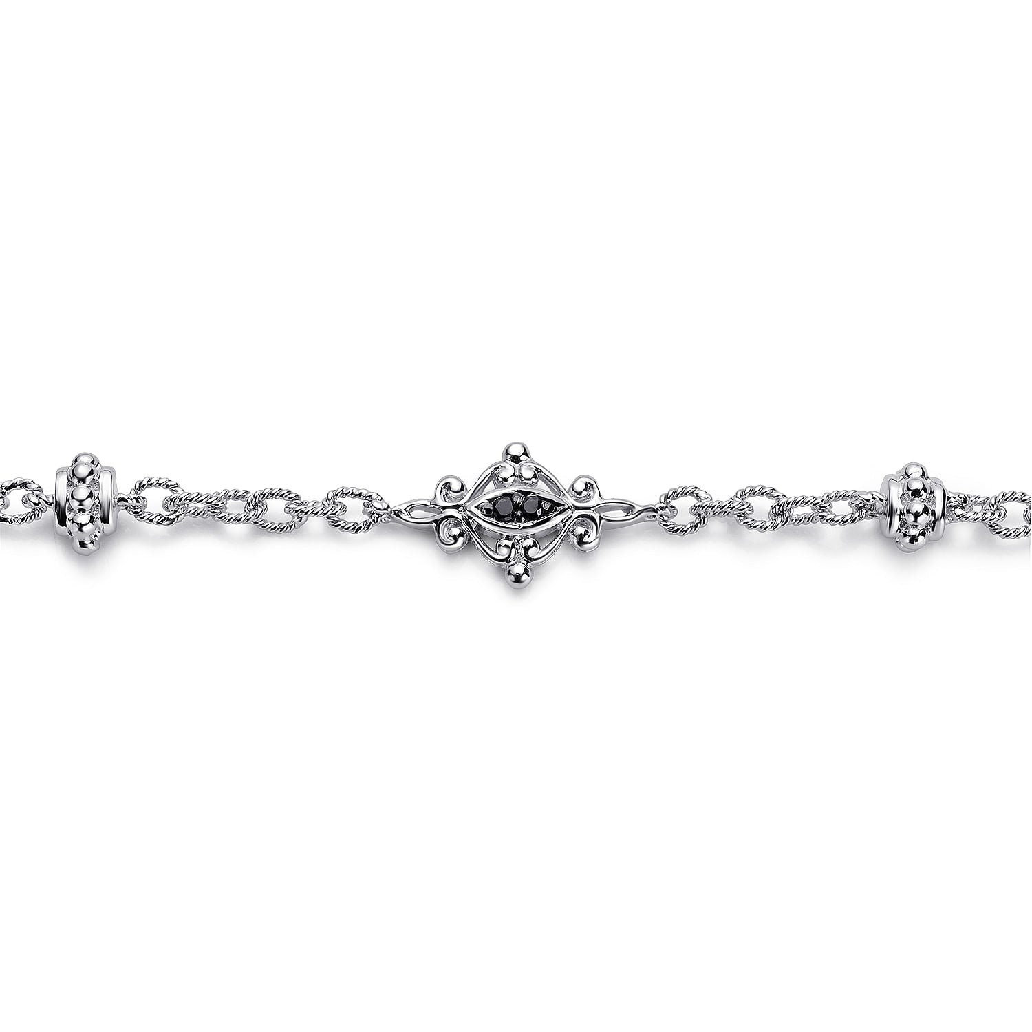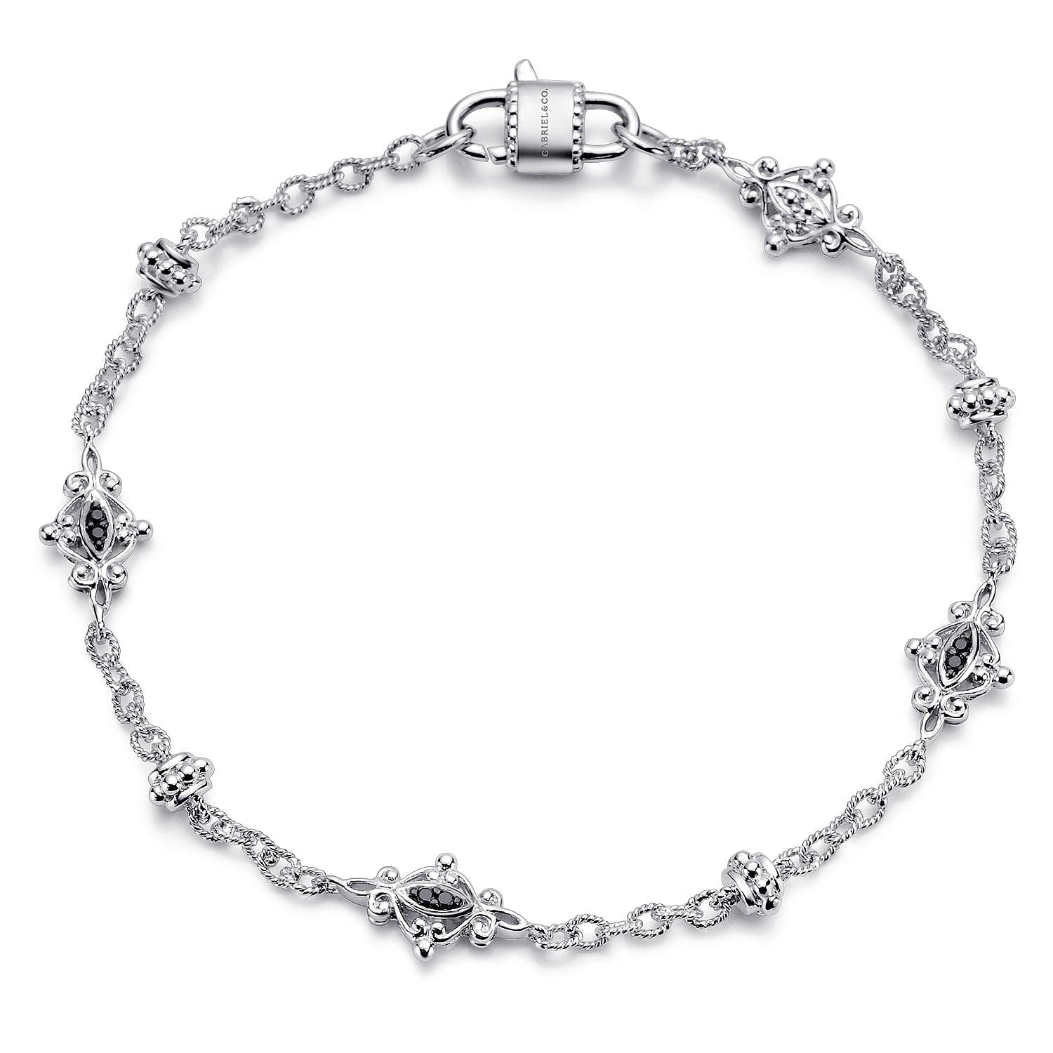 Delicately crafted chains of 925 sterling silver encompass the wrist with grace and class, while allowing for subtle moments of sparkle. With intricate filigree design work, this Victorian collection bracelet is accented with deep black spinel stones evenly placed around the bracelet. A romantic style with a story to tell, a bracelet so refined will not go unnoticed.