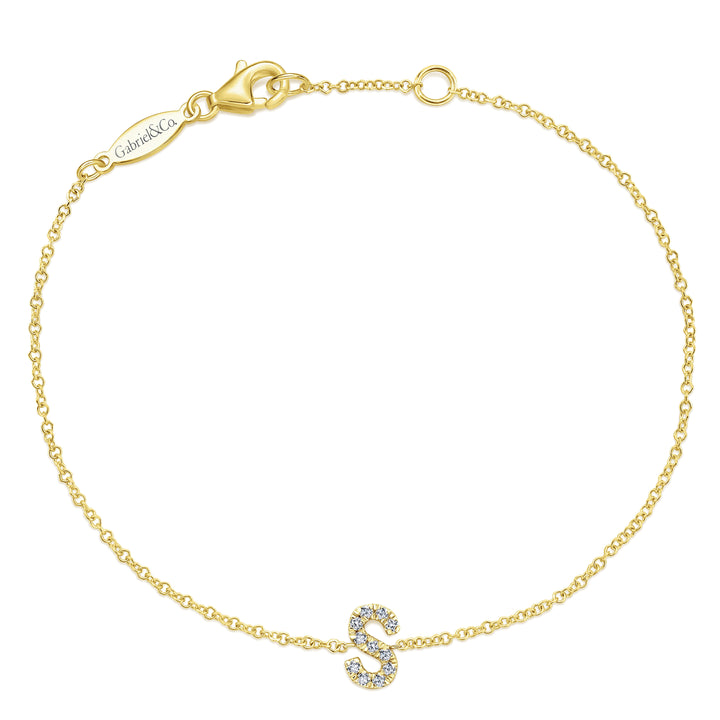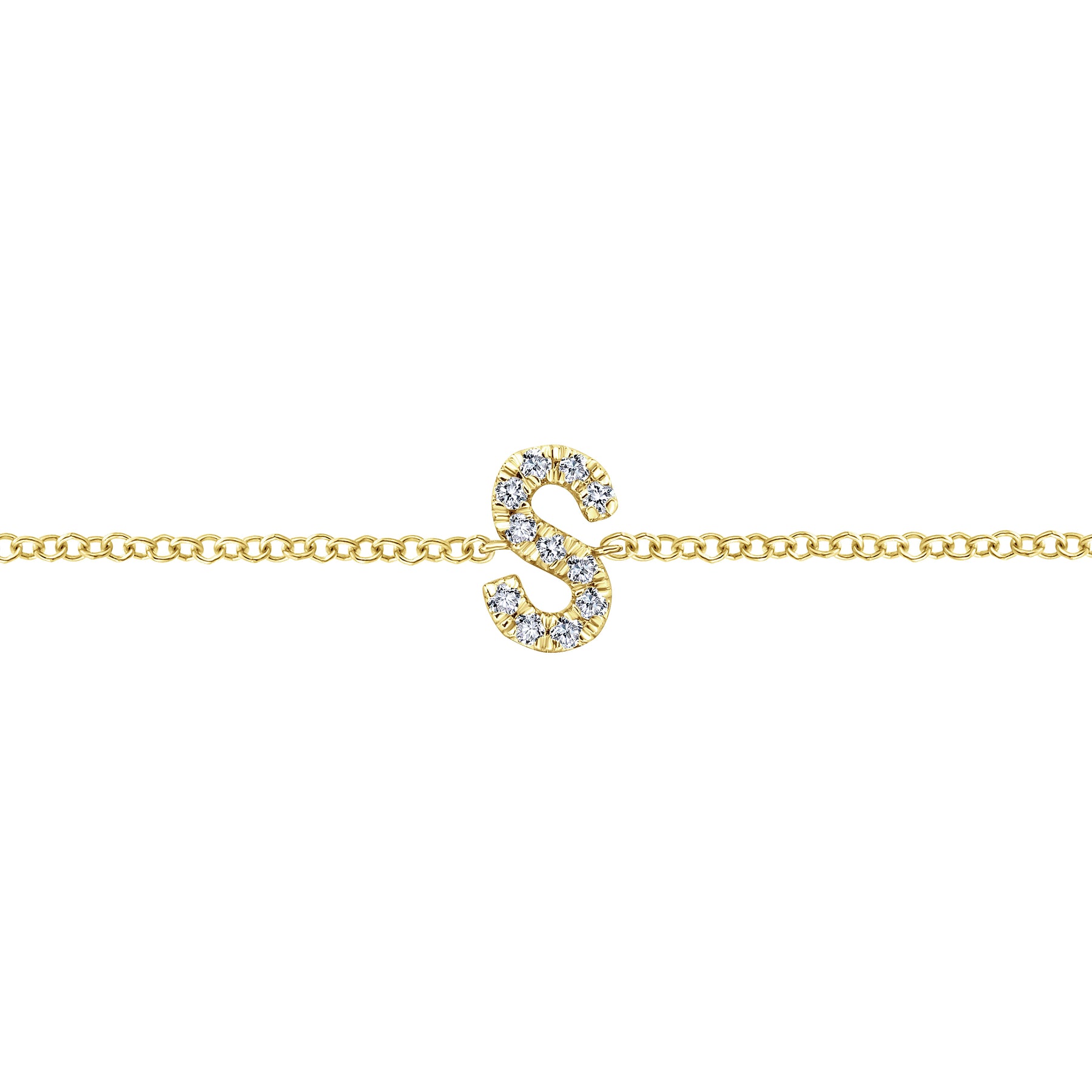 Delicate 14K yellow gold chain bracelet accented with the letter ?S? in brilliant sparkling diamonds. This bracelet makes for a beautiful foundation piece for any woman?s jewelry collection.