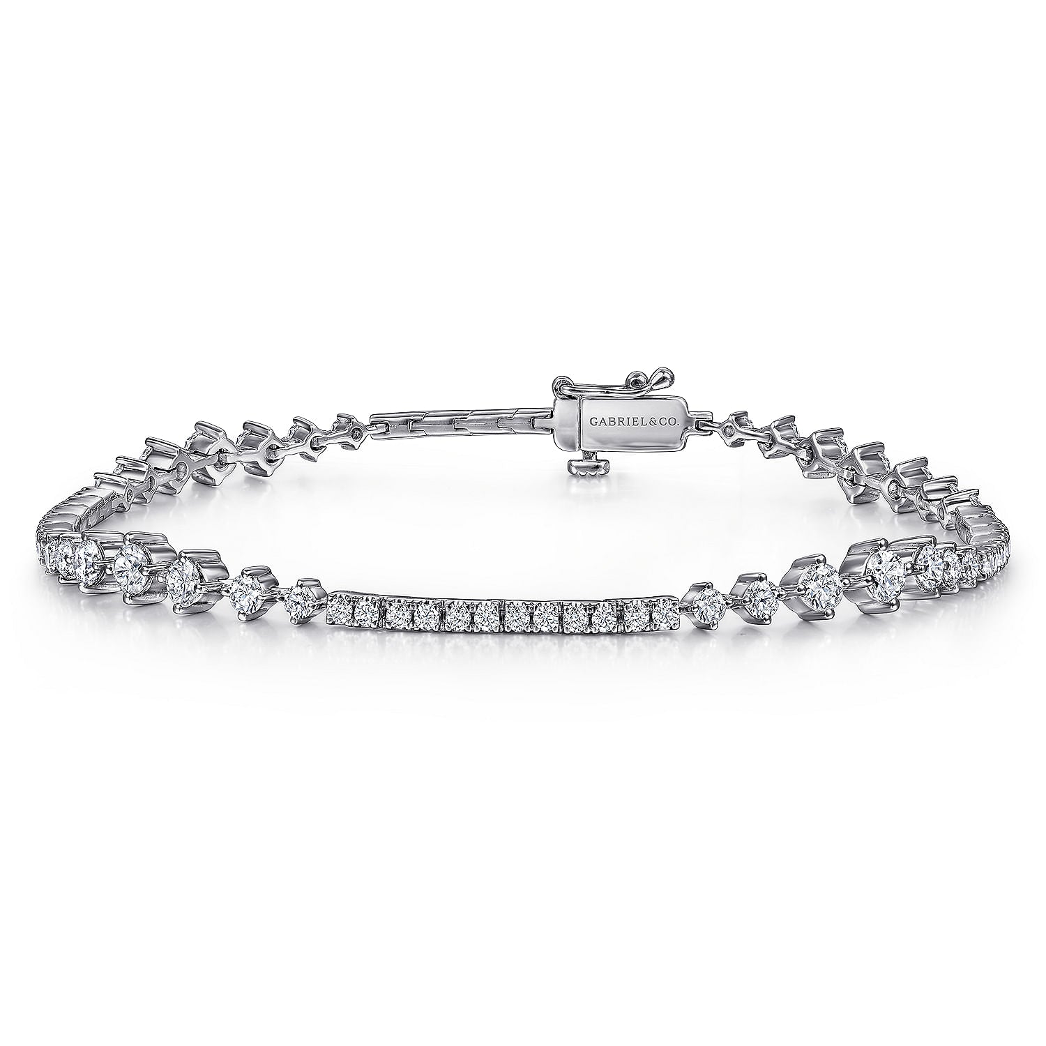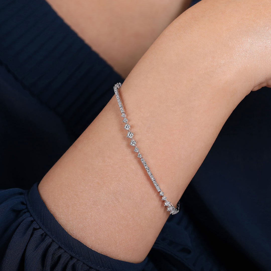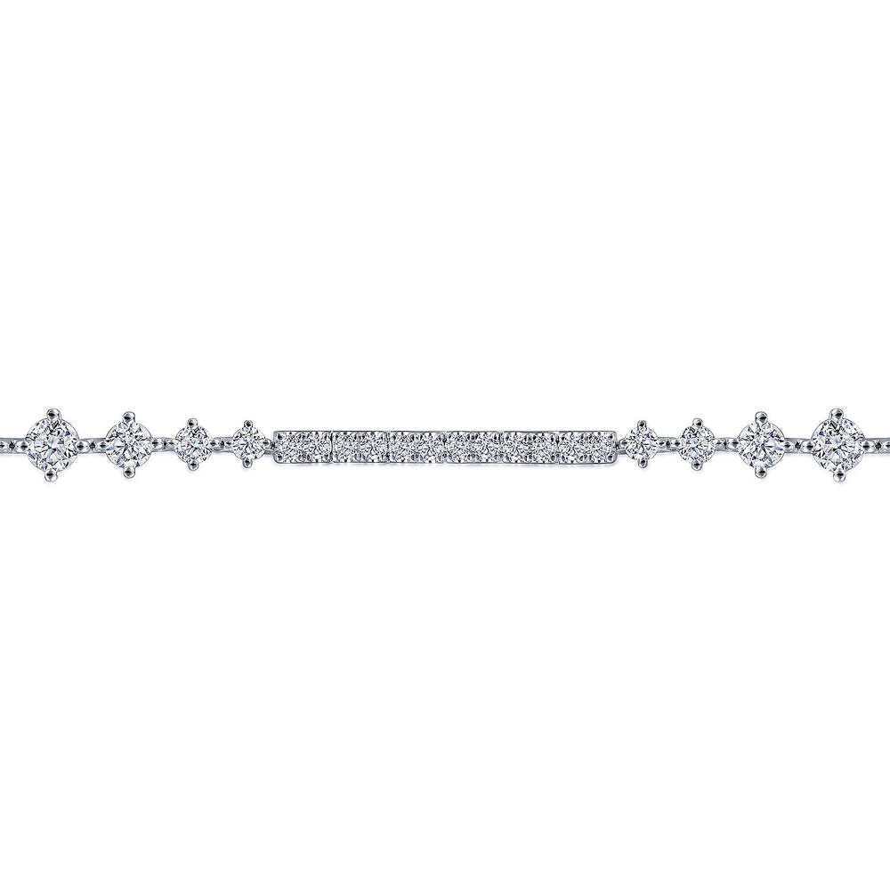 Designed for day-to-night wear, this Lusso collection tennis bracelet flaunts 1.91cts of diamonds. Bars of pav???????? diamonds alternate with segments of graduated, prong set round diamonds in an eye-catching design. Redefine opulence with this 14K white gold tennis bracelet.