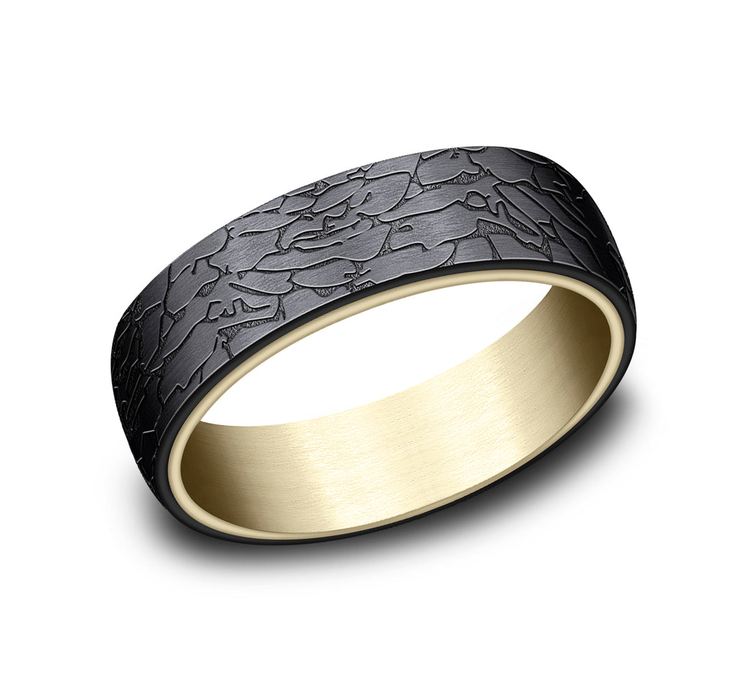 | Additional Description | 6.5mm, Comfort fit 14K Yellow Gold and Black Titanium Fractured rock pattern |