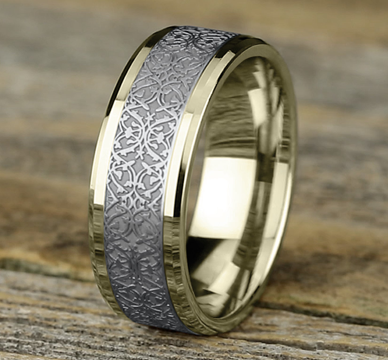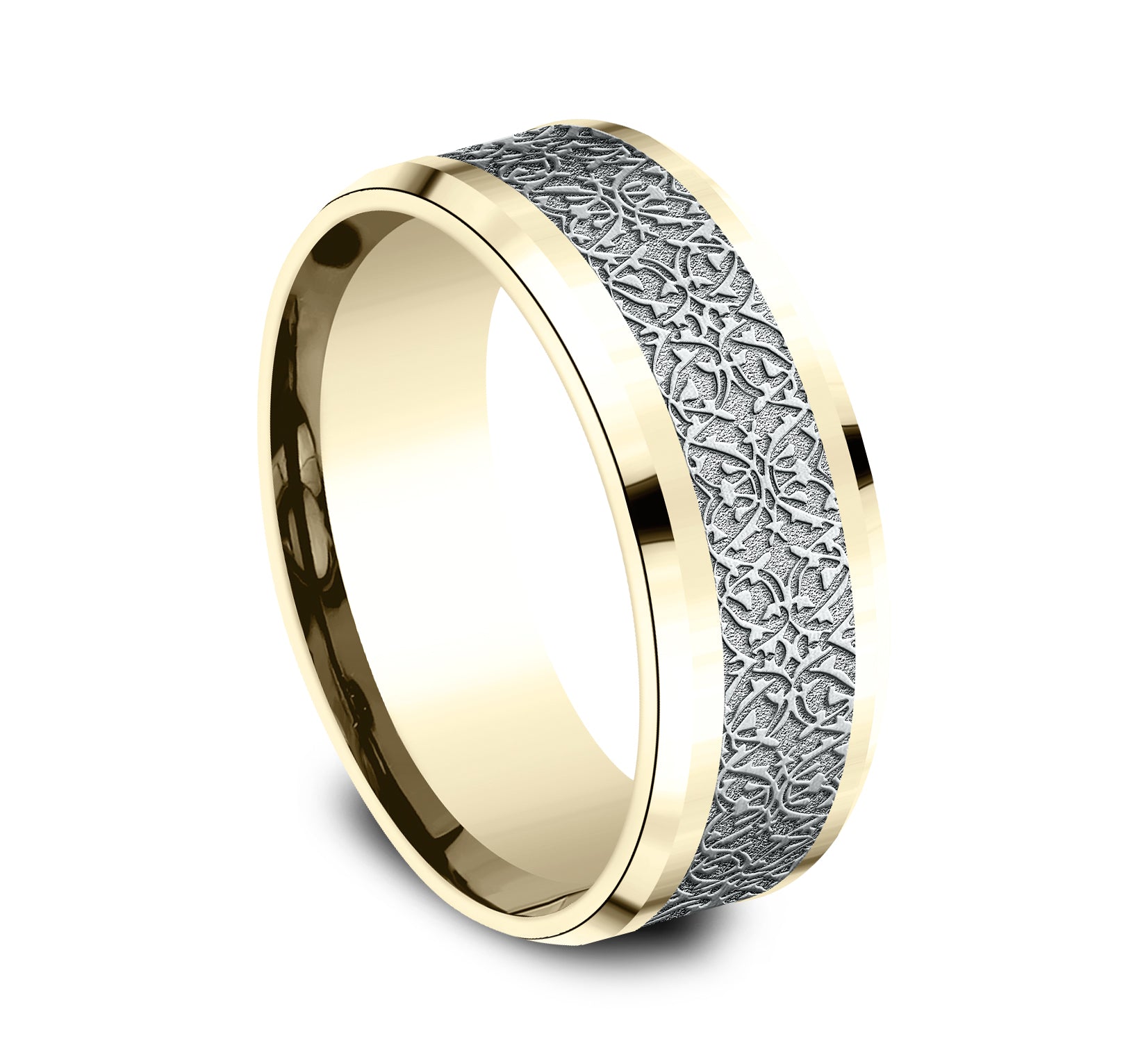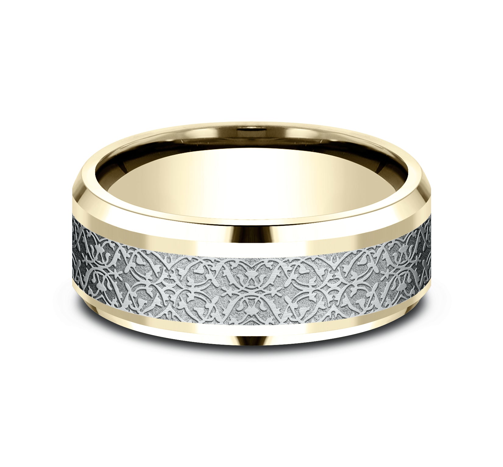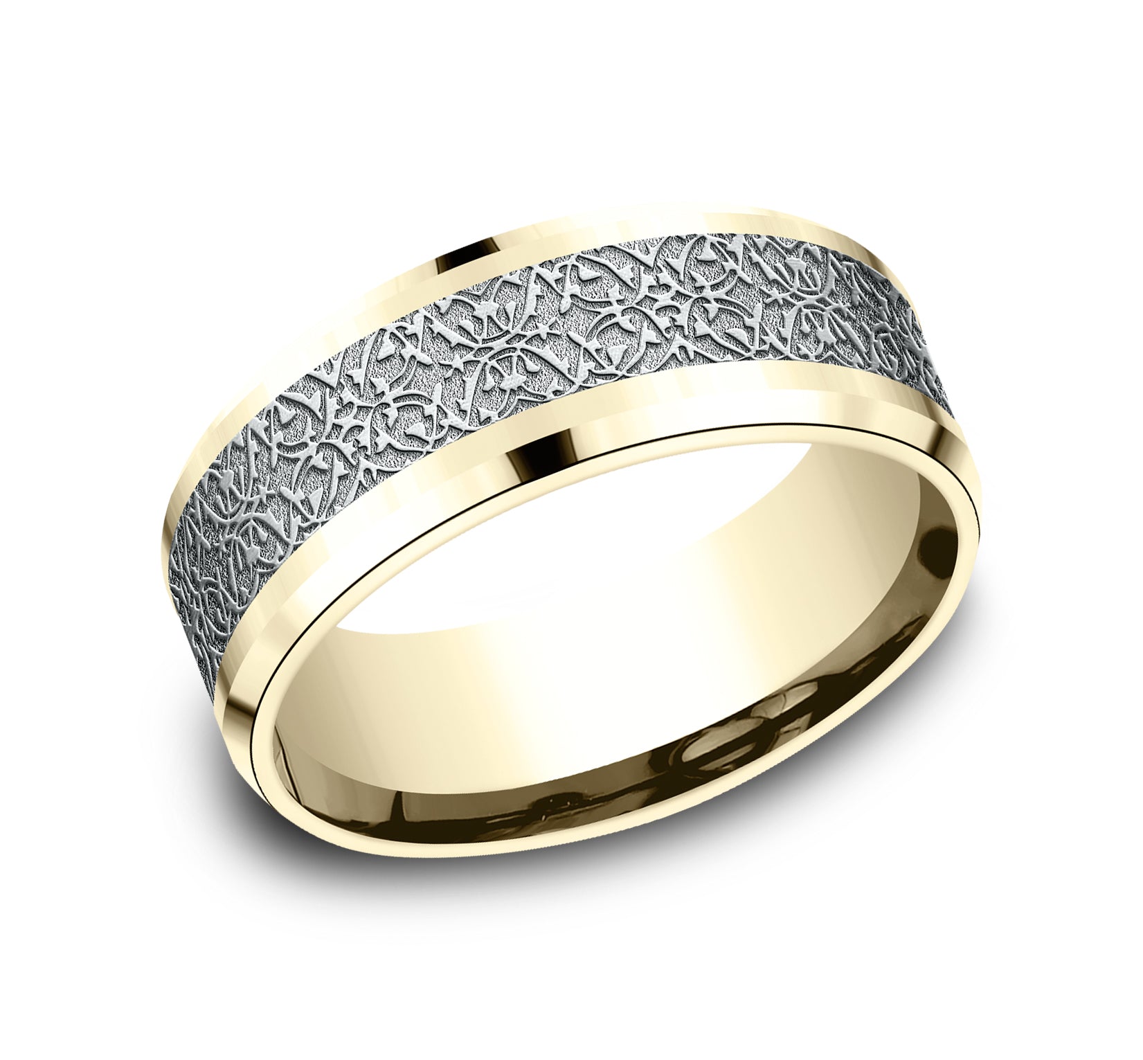 | Additional Description | 8mm, Comfort fit 14K Yellow and White Gold Ottoman pattern, polished drop bevel edges |