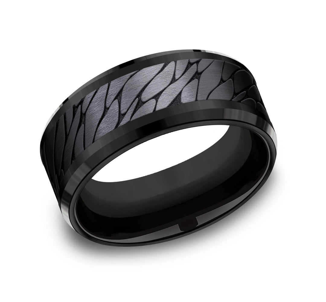 | Additional Description | 9mm, Comfort fit Black Titanium Pebble patterned center, bevel edges |