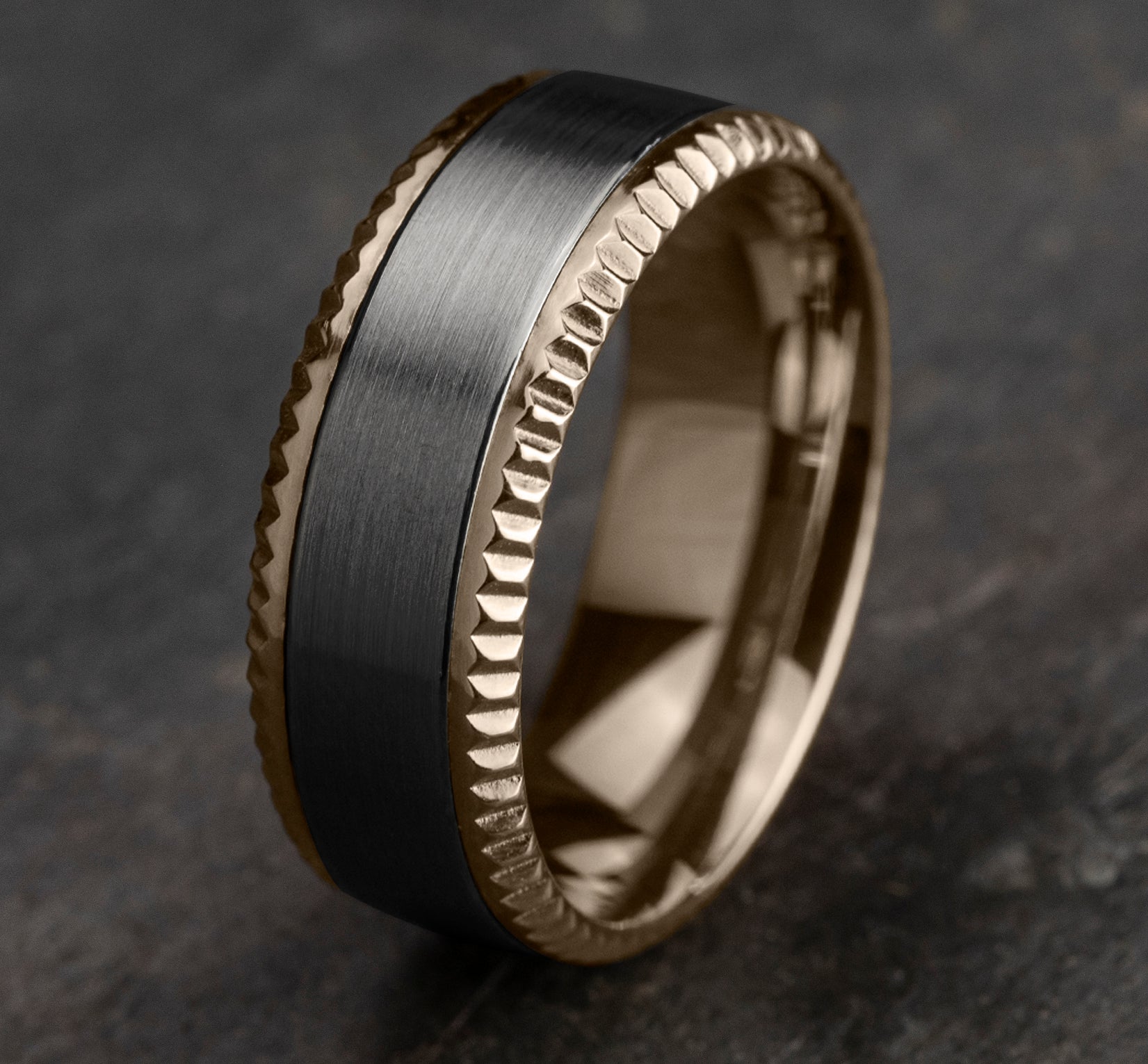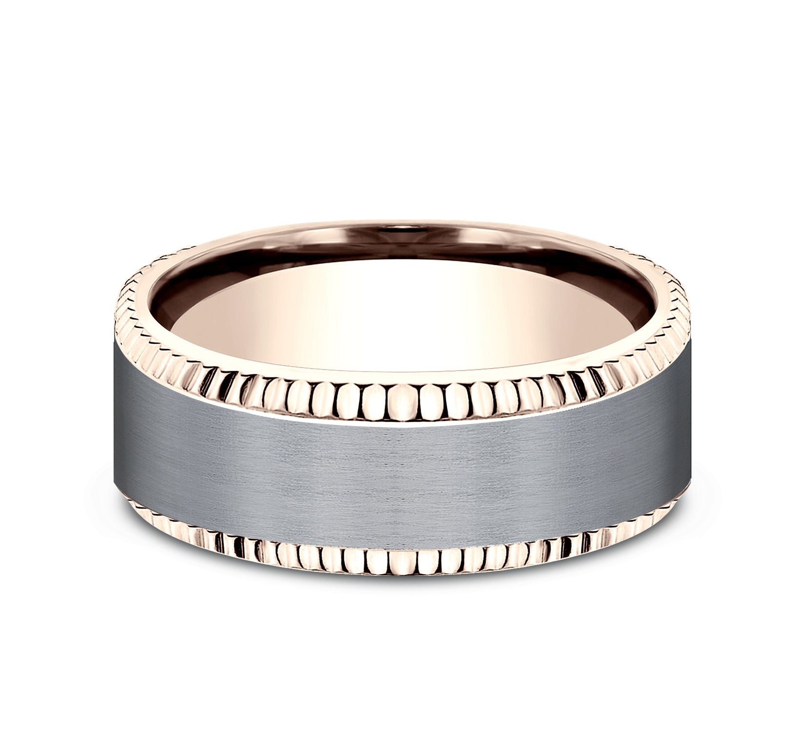 | Additional Description | 8mm, Comfort fit 14K Rose Gold and Grey Tantalum Satin center,fluted bevel edges |