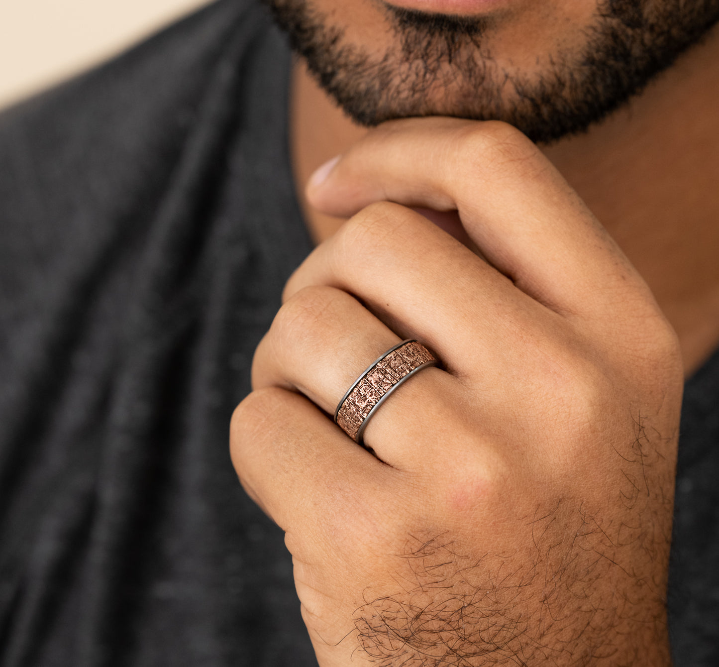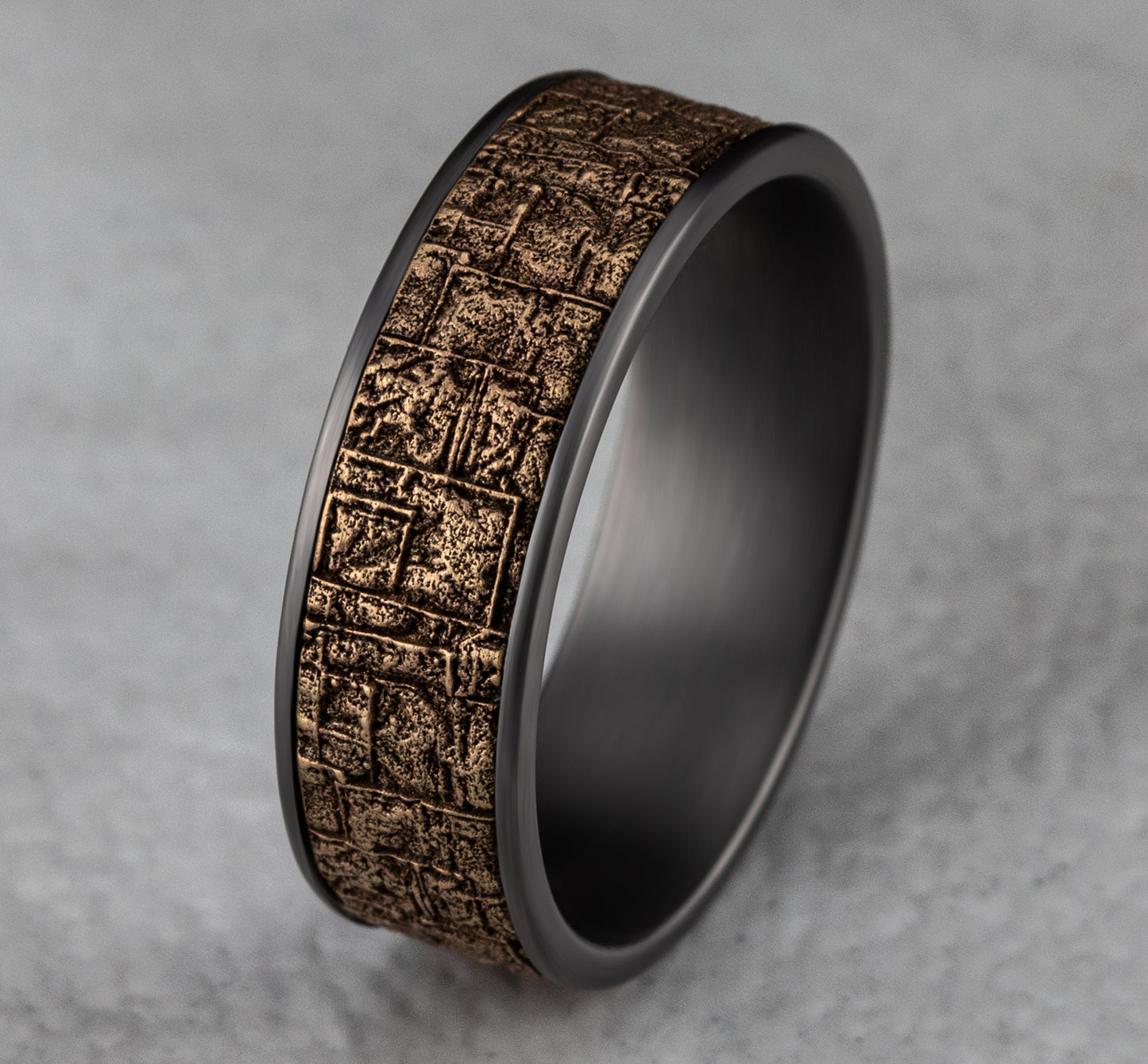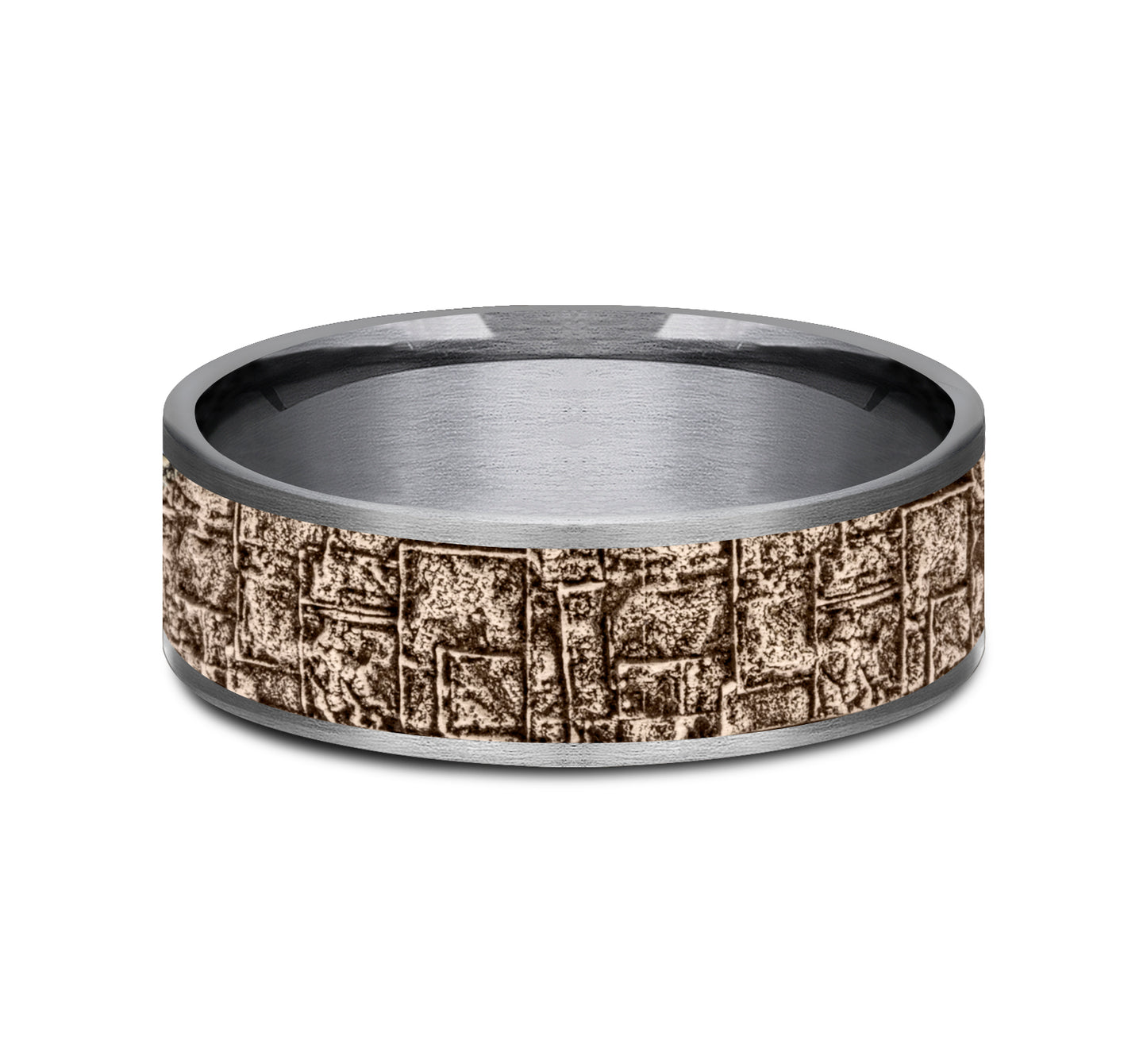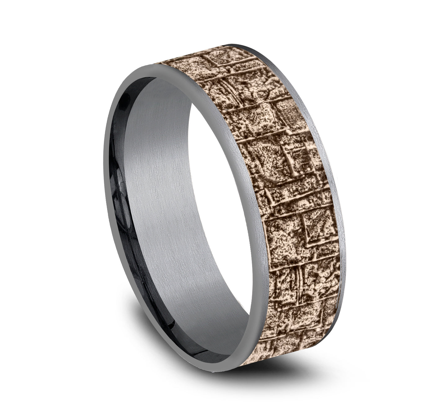 | Additional Description | 7.5mm, Comfort fit Grey Tantalum and 14K Rose Gold Bamboo pattern, thin edges |
