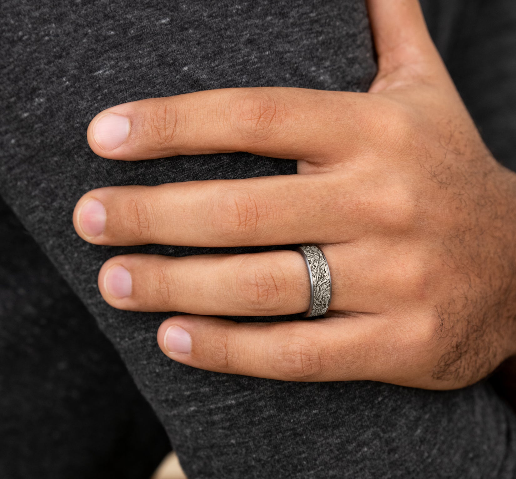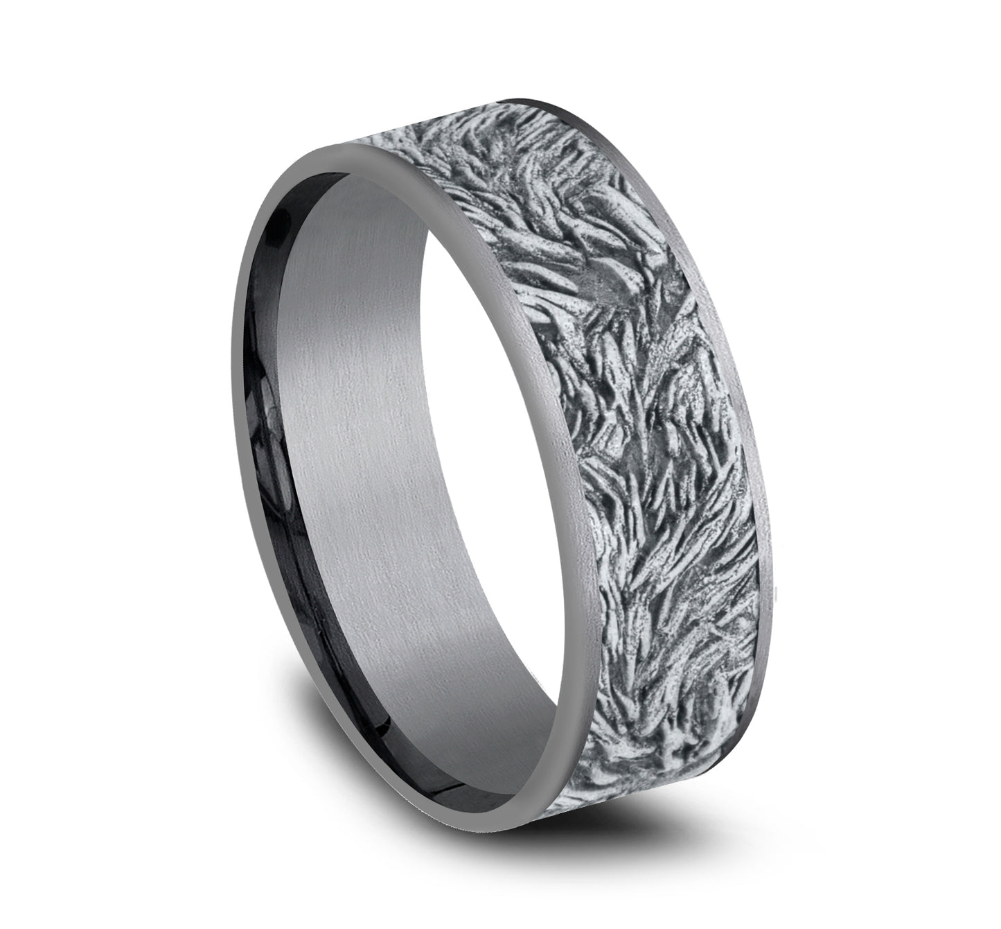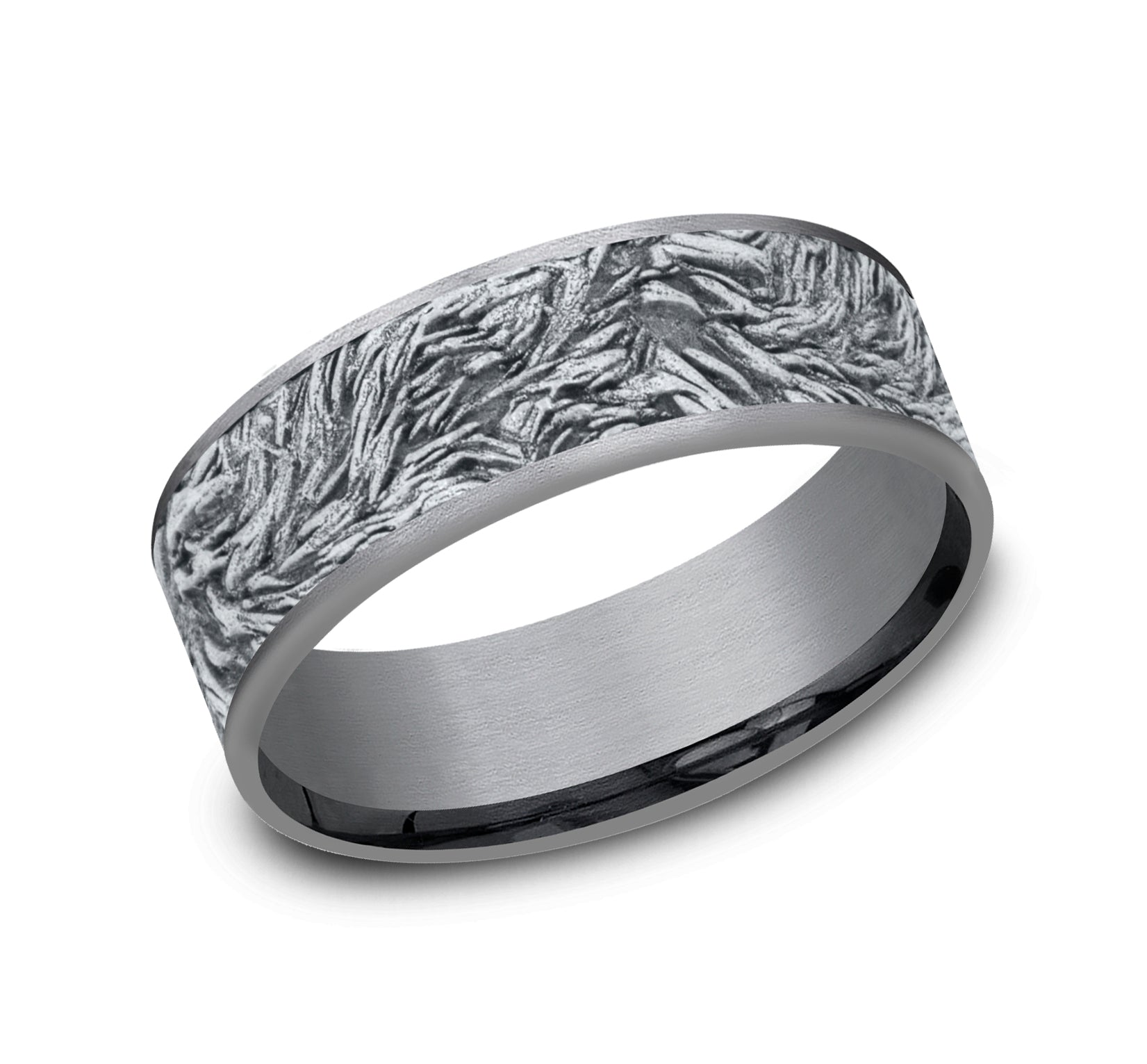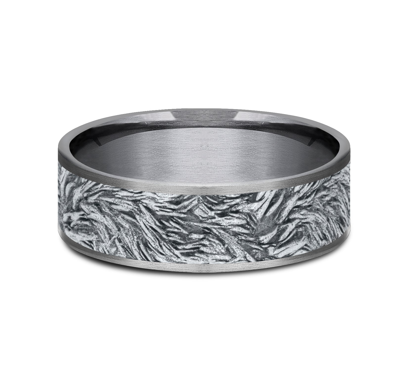 | Additional Description | 7.5mm, Comfort fit Grey Tantalum and 14K White Lions mane patterned center, thin edges |