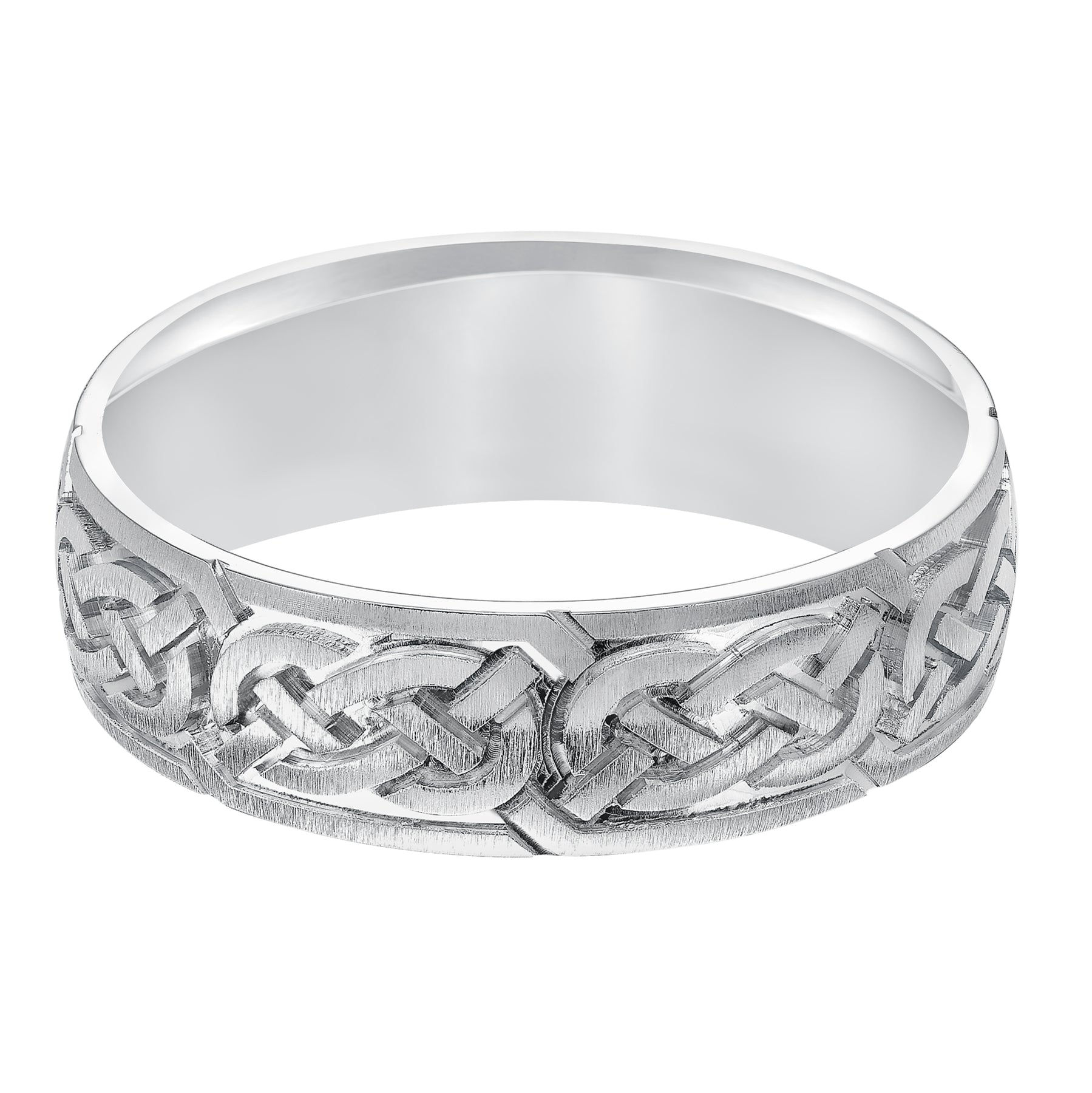 Additional Description This finely crafted, Comfort Fit wedding band features an exquisite Celtic knot design, satin finish and flat edges to complete the look